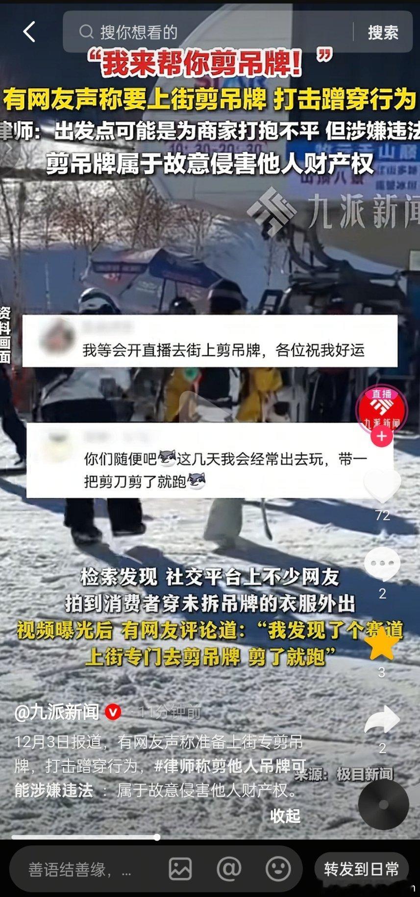 有网友声称要上街剪吊牌,打击蹭穿行为。律师:出发点可能是为商家打抱不平,但涉嫌违法,剪吊牌属于故意侵害他人财产权。热点现场