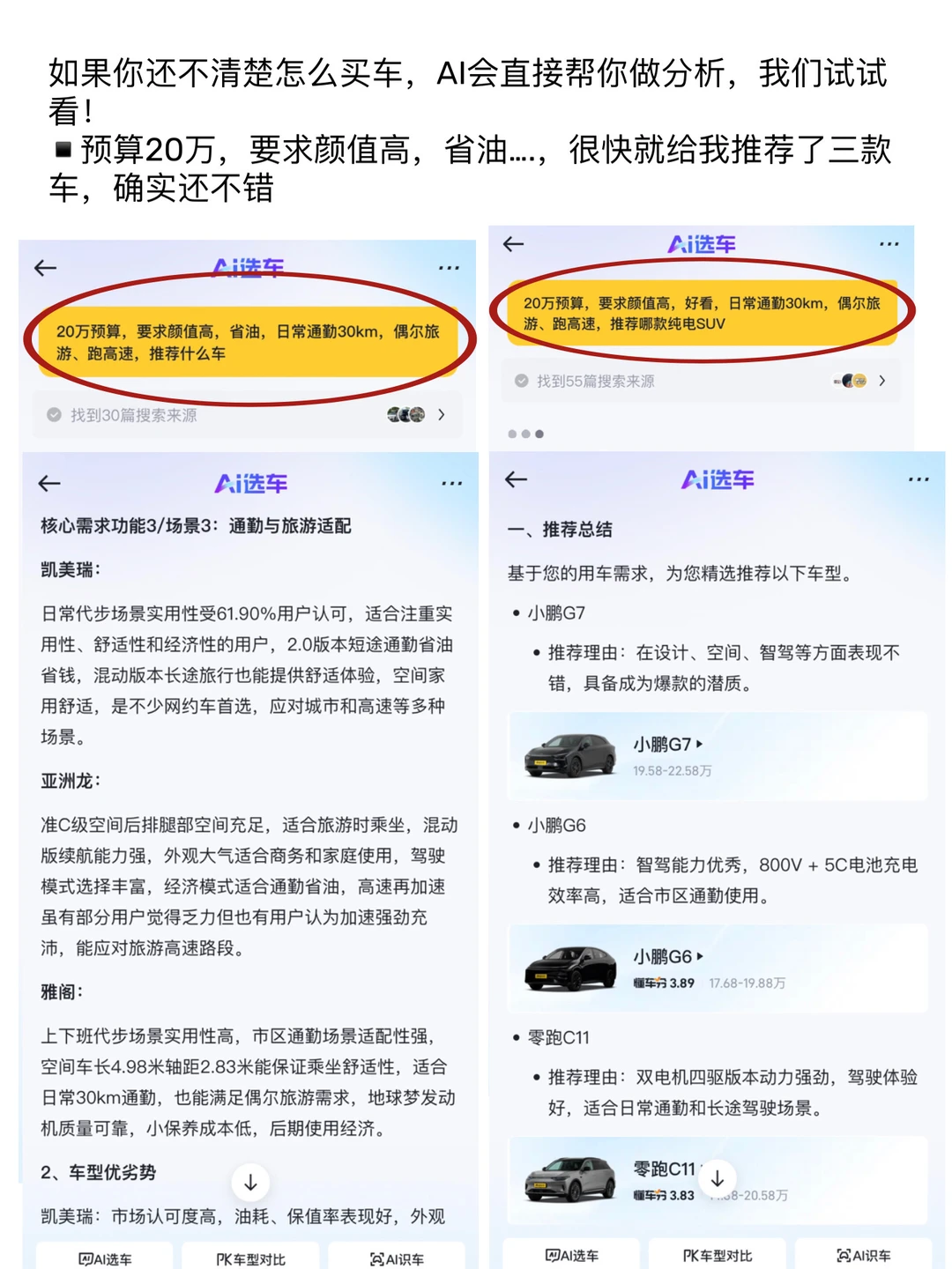 📈比如我问“预算20万,要求颜值高,省油,日常通勤30km,偶尔旅游、跑长途,推荐什么车”,很快就给我推荐了三款车,这三款车确实还不错,都是比较热门的车型!我觉得分析的还挺靠谱的!