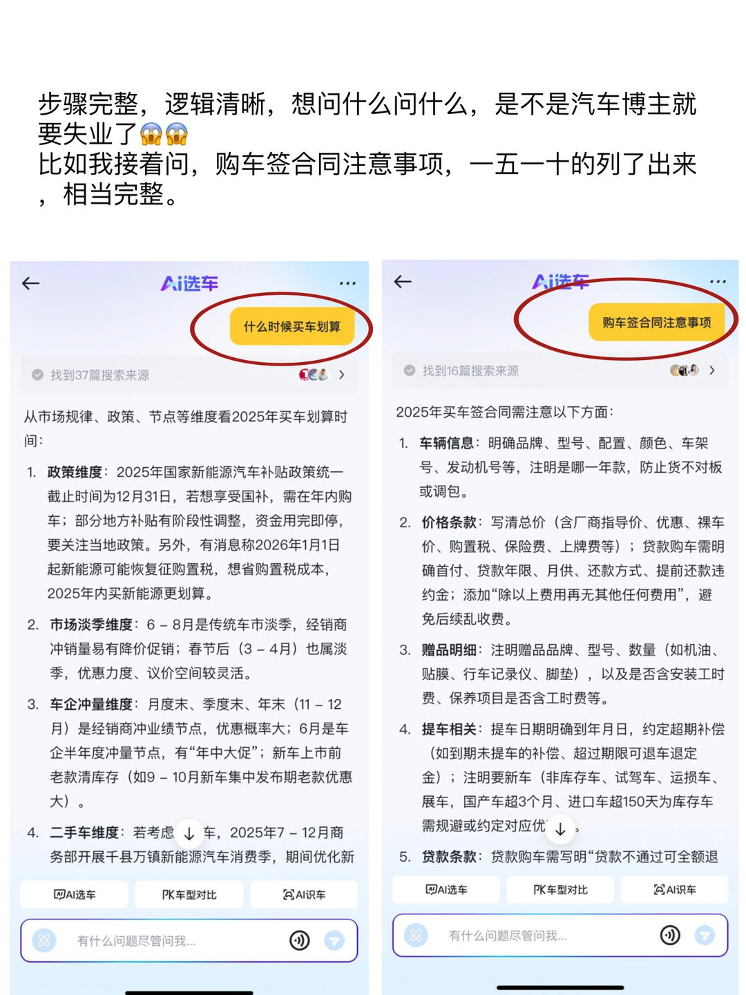 ✔️比如我接着问,购车签合同注意事项,一五一十的列了出来相当完整(比我手动整理的还要更完整)