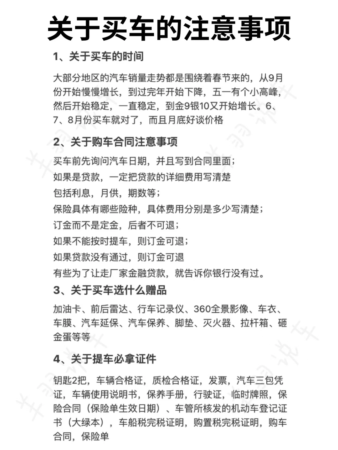 买车前先询问汽车日期,并且写到合同里面;如果是dk,一定把dk的详细费用写清楚,包括利息,月供,期数等;具体有哪些险种,具体费用分别是多少写清楚;订金而不是定金,后者不可退;如果不能按时提车,则订金可退;如果贷款没有通过,则订金可退,有些为了让走厂家金融dk,就告诉你银行没有过。