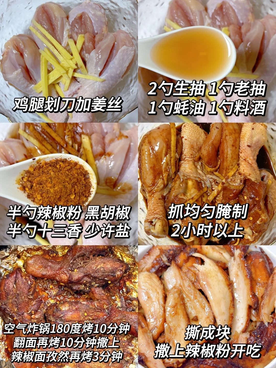✅腌制配方:鸡腿划刀➕姜丝➕2勺生抽➕1勺老抽➕1勺蚝油➕1勺料酒➕半勺辣椒粉➕半勺黑胡椒粉➕半勺十三香➕少许盐抓均匀腌制2小时以上姐妹们快去试试吧~真滴巨巨巨好吃😋