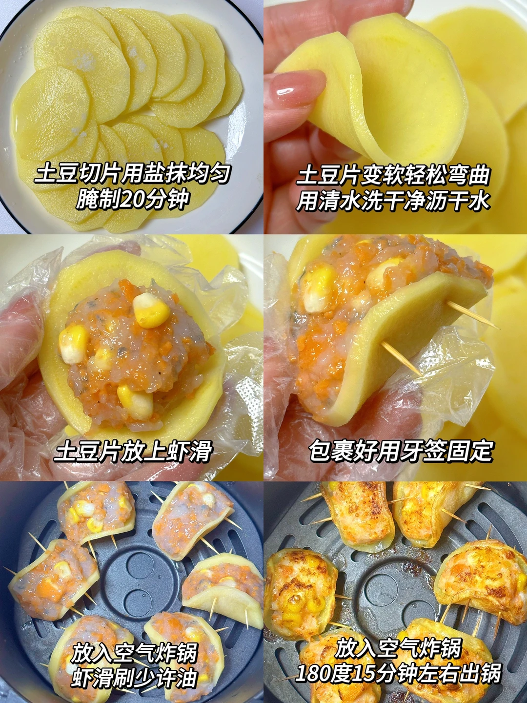 今天给家人们分享一道颜值高还好吃的空气炸锅土豆虾滑,巨巨巨好吃😋,土豆胡萝卜玉米🌽都是优质碳水,虾仁优质蛋白,家人们一定要试试,不难巨简单,减脂期的家人们赶紧试试吧!!!! 🥗食材:虾仁、土豆、胡萝卜、玉米粒 🥘做法:如图所示(看图5⃣️、图6⃣️)