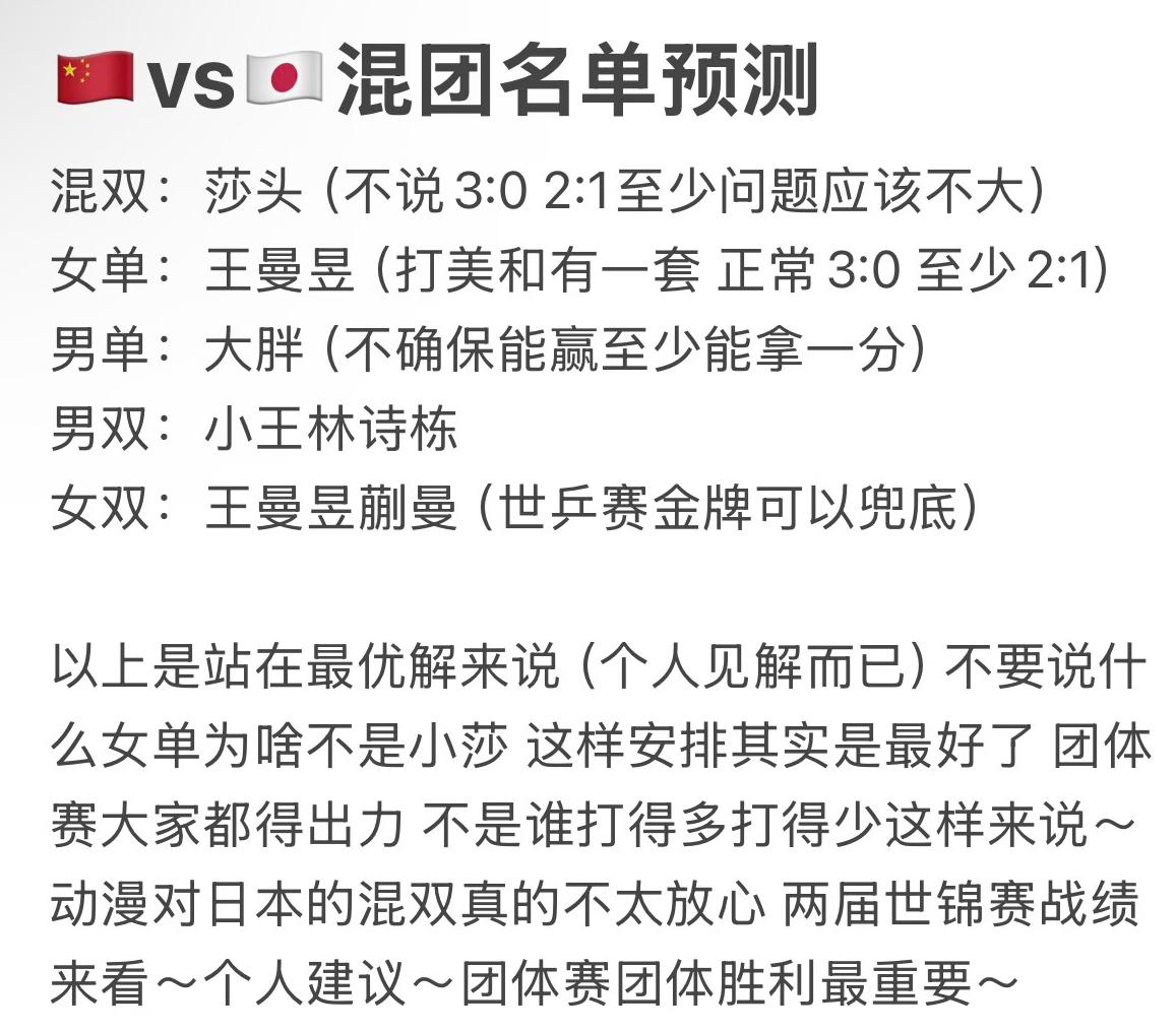 成都混团第二阶段中国队VS日本的参赛名单预测 混双 孙颖莎/王楚钦,不说3:0,2:1应该问题不大! 女单上王曼昱,曼昱打张本美和 有一套,正常3:0拿下, 至少2:1对手! 第三盘 梁靖崑的男单, 不确保能赢下来, 但至少能得一分! 男双,王楚钦/林诗栋, 女双,王曼昱/蒯曼 感觉这就是洛杉矶奥运会的阵容, 王励勤主席强调, 这次成都混团, 就是奥运会的预演, 经过比赛的不断磨练, 各方面综合能力提高, 能参加奥运会阵容是 运动员的终极目的!