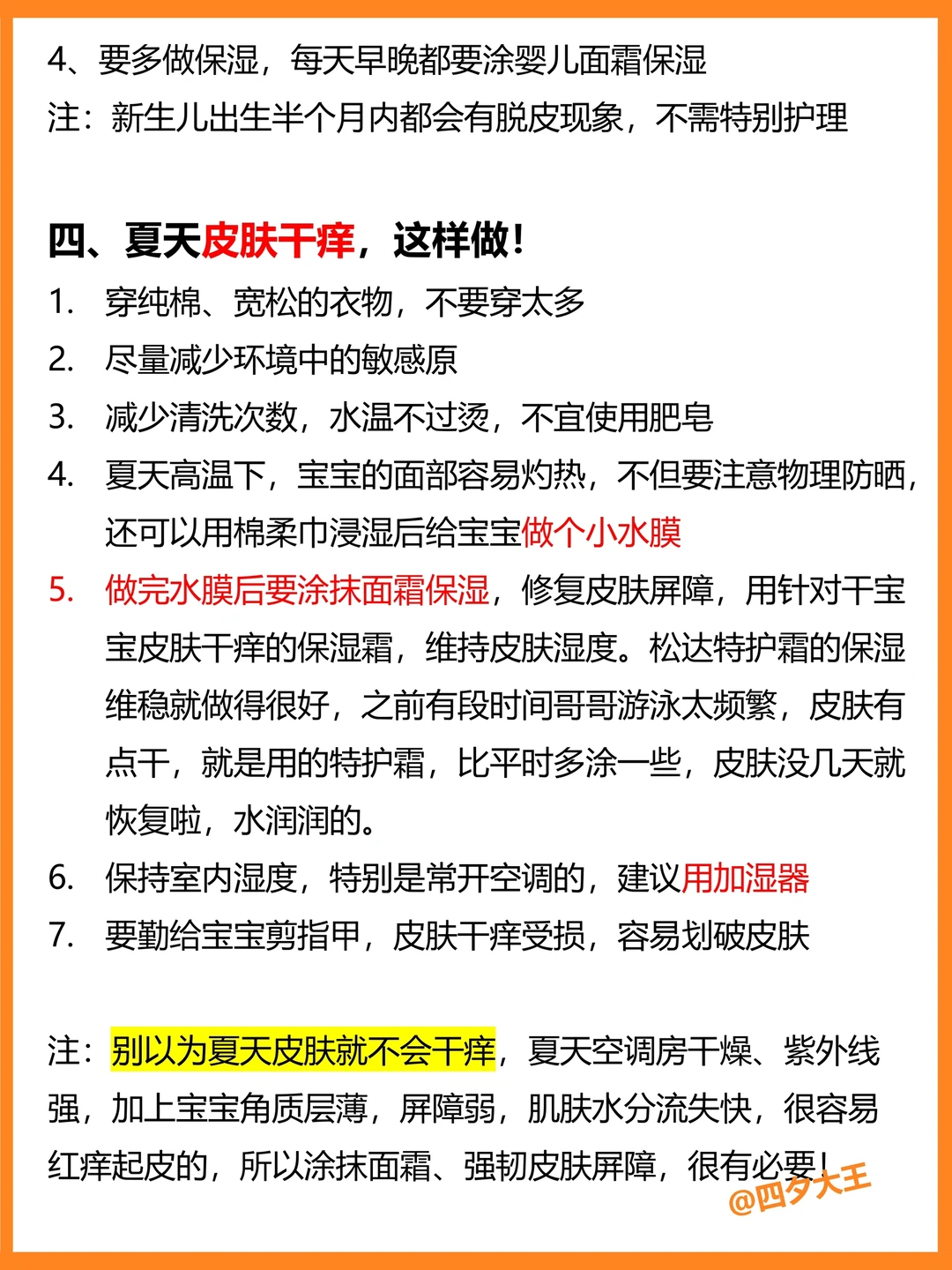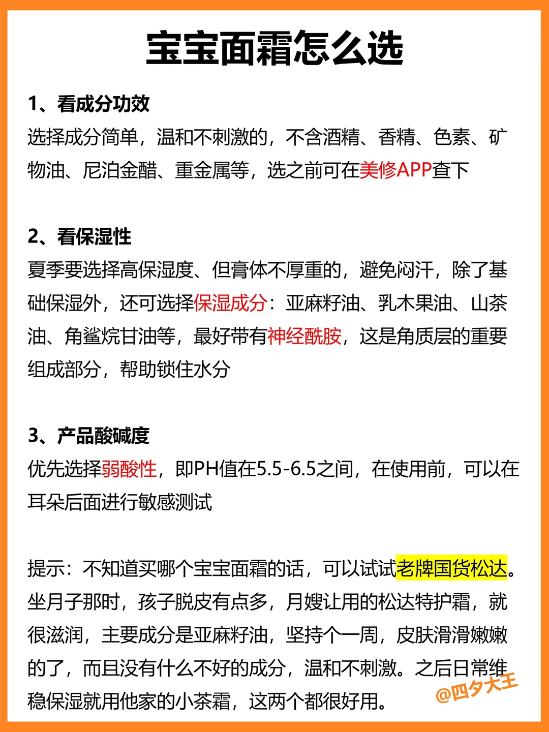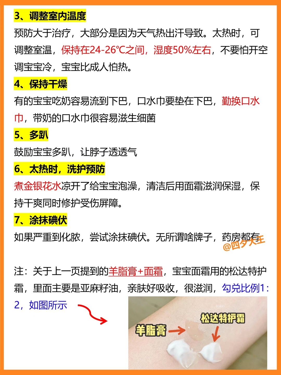 🔹像我家宝宝肉嘟嘟的,真的是一不小心就淹脖子什么的,老母亲都护理出心得来了。皮肤干爽和滋润真的很重要。小月龄的时候,✔️多练习抬头,晾一下脖子上的褶皱肉肉,避免汗液淹红皮肤,✔️平时洗完澡后则要注意保湿,修护皮肤屏障,松达特护霜就很好用,👉30多年的老牌国货了,主要成分是亚麻籽油,滋润度很高,平时干痒泛红,立刻涂这个,很快就滑滑嫩嫩的。这么多年了依然口碑好,用着很安心。