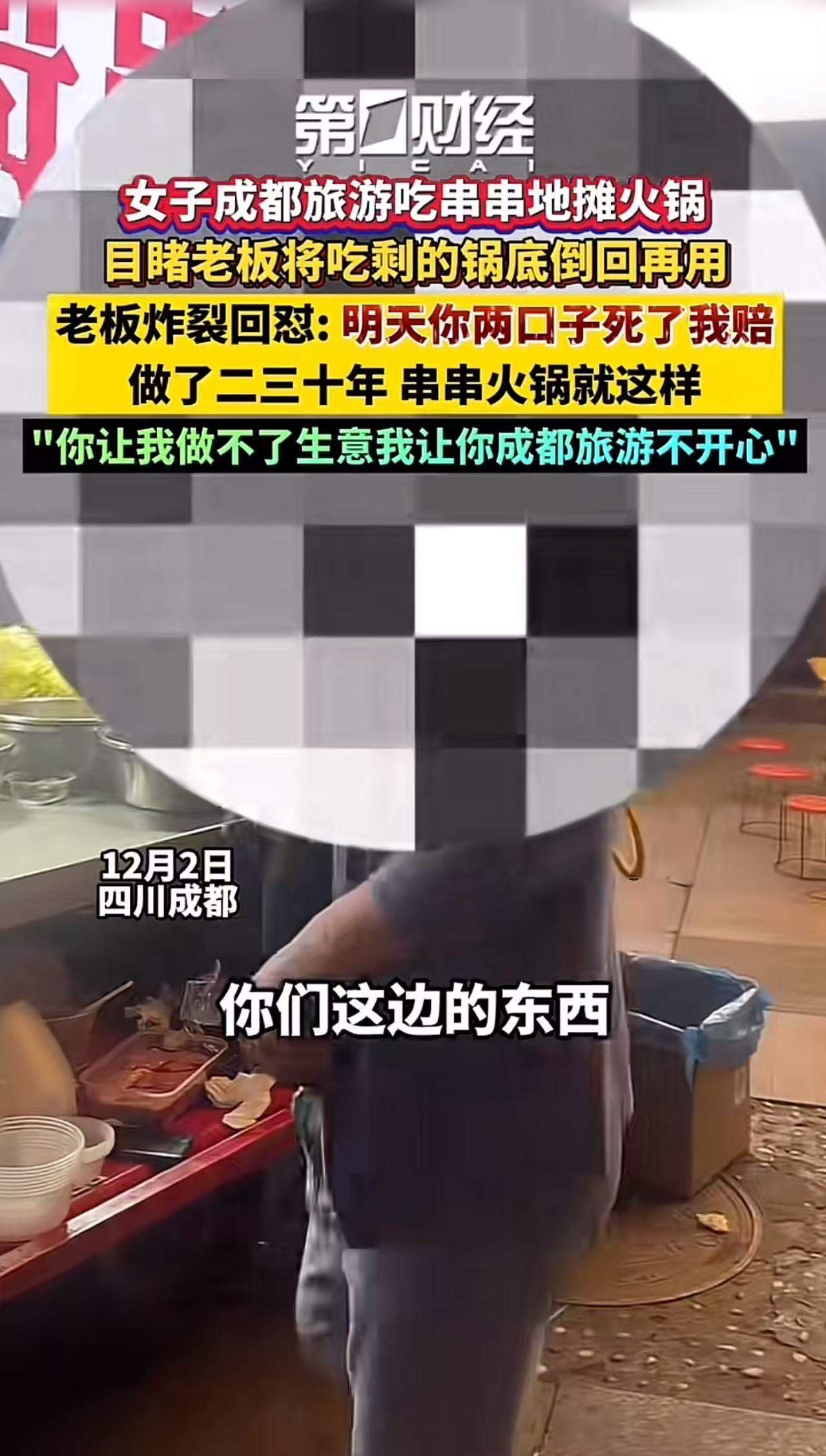 一个人差点毁了一座城!女子去成都旅游吃串串地摊火锅,目睹老板将别的顾客吃剩的锅底倒回再用,质问老板怎么能这样做?可没想到老板理直气壮地说 :“我干了几十年都是这样做的,明天你两口子如果吃死了我赔!”网友:奸商太缺德了,万一有乙肝吃的就害人了!