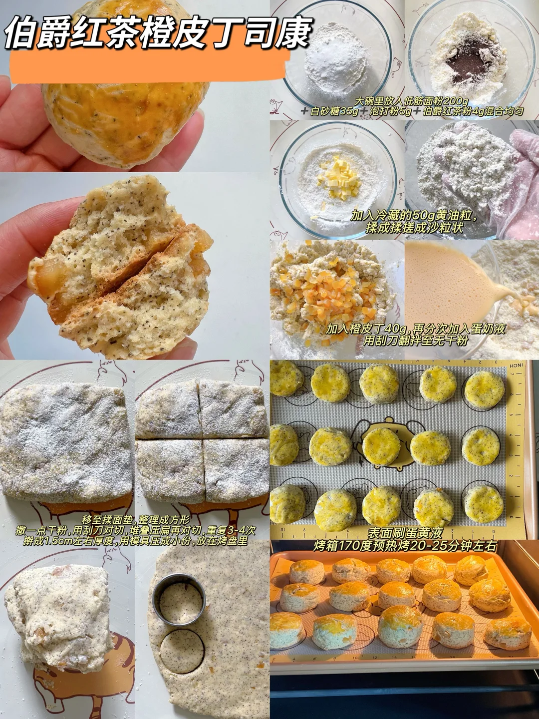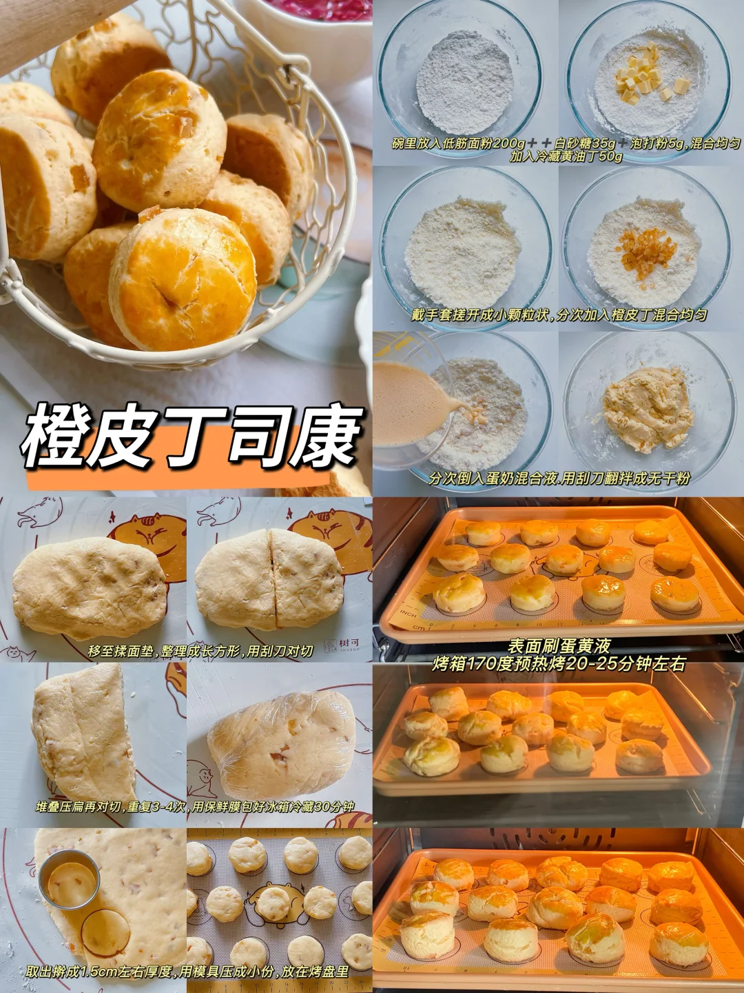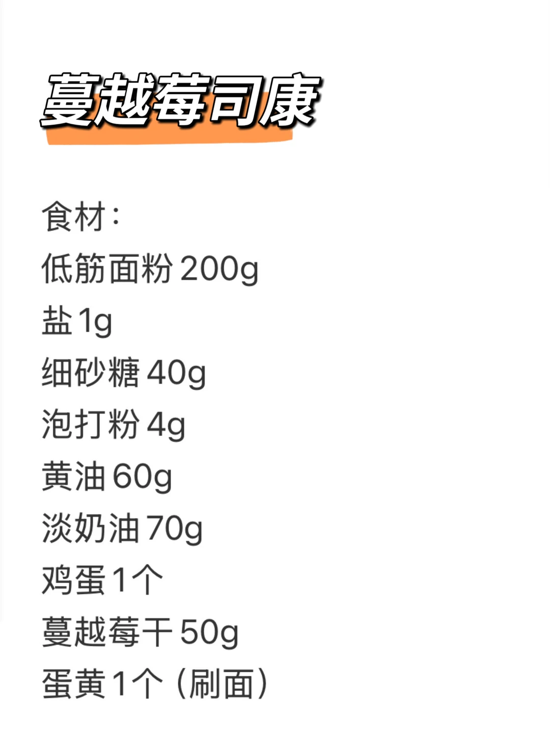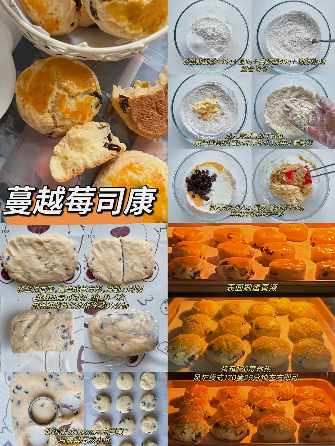 吃了甜食会开心 zui适合烘焙小白的莫过于司康啦 材料简单,只要有面粉、黄油、鲜奶油或牛奶、鸡蛋、泡打粉就可以做 随心添加一点你喜欢的葡萄干、蔓越莓、橙皮丁、奥利奥碎、巧克力等小料 可以变化出不同口味的司康 基本不会翻车[派对R][派对R][派对R] 一起来看看吧! 配方见图,详细文字操作步骤可以进主页🔍 🌈蔓越莓司康 🌈伯爵红茶橙皮丁司康 🌈橙皮丁司康 🌈开心果千层司康 ⚠️基本操作步骤: 1️⃣低筋面粉、糖、盐、泡打粉混合均匀 2️⃣加入冷藏黄油丁搓成沙粒状(也可以用料理机,不过手搓的感觉很治愈~~ 3️⃣加入牛奶或淡奶油、蛋液等湿性材料,翻拌成团,如果小料,可在成团前加入。 4️⃣整形后,冷藏静置1小时 (不冷藏也无妨) 整形方法: 可以上下铺油纸,擀面杖擀成长方形或圆形,直接用刮刀切分或用模具压成小块 5️⃣烤箱180度预热,烘烤20-25分钟左右,具体看上色 ⚠️Tips: 1️⃣黄油需要冷藏的,不要过度揉搓和翻拌,避免黄油融化和产生过多的面筋 如果有料理机是最好的,直接上料理机打成沙砾状,若没有,也可以用刮板切拌或者戴手套快速揉搓的方式(最喜欢的步骤,很治愈)