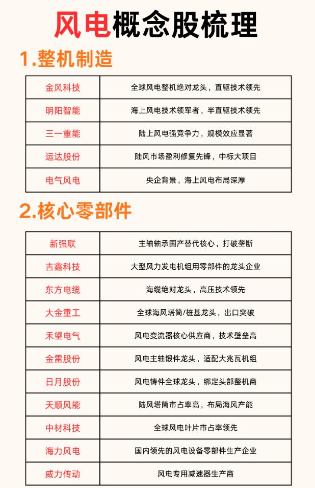 风电概念股数据汇总(名单),建议查看! 今天午后,风电板块震荡走强,多只个股表现活跃。其中,大金重工涨停,中环海陆涨幅超过10%,金雷股份、盘古智能、新强联、运达股份等也纷纷跟涨。 近期,多个大型风电项目陆续公布风机采购中标候选人,合计规模达1.25吉瓦(GW),显示出行业建设节奏正在加快。 同时,有关部门近期发布政策文件,鼓励国内在光伏、风电、锂电池及新能源汽车等绿色低碳领域的优势企业拓展海外市场,积极参与国际绿色能源项目建设,推动绿色技术与解决方案的国际合作。 开源证券研报指出,《风能北京宣言2.0》提出,“十五五”期间(2026–2030年)我国风电年均新增装机容量有望达到120吉瓦以上,其中海上风电年新增不低于15吉瓦。这一目标为风电行业中长期发展提供了清晰指引,装机规模有望持续提升。 目前,陆上风电市场竞争格局趋于理性,产业链盈利水平逐步改善;海上风电则凭借资源条件和政策支持,仍具备较大发展空间。 此外,随着海外市场需求逐步释放,国内风电企业正加快国际化布局,积极开拓新的增长机会。国内龙头企业加速布局全球,出海步伐明显加快,为行业打开第二增长曲线。