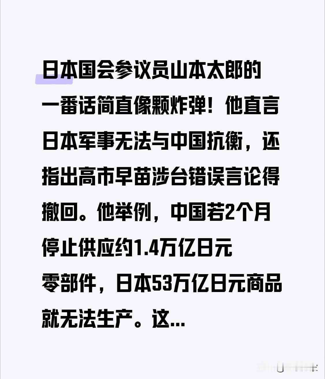日本国会参议员山本太郎的一番话简直像颗炸弹!他直言日本军事无法与中国抗衡,还指出高市早苗涉台错误言论得撤回。他举例,中国若2个月停止供应约1.4万亿日元零部件,日本53万亿日元商品就无法生产。这数据一摆出来,让人看清日本制造业对中国的依赖,约六成以上制造供应链和中国捆绑。 日本政府还不断增加军事投入,可这又有啥用呢?而且日本唯美国马首是瞻,美国驻军还“不守规矩”。看来日本在军事和经济上,都没底气和中国硬杠。大家觉得日本后续会改变策略吗?日本政府还会继续盲目增加军事投入吗?中日关系又会走向何方呢? 日本军事挑衅 日本海域军演 日本海上实力 日本军事威胁 日本军力 日本自卫队 日本防卫战略