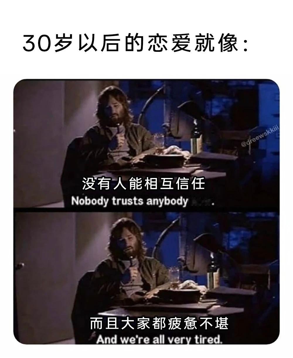 二十岁的爱炽热而又勇敢,有燃烧一切的勇气。三十岁的爱沉稳而又克制,更多的是相互间的利弊权衡meme