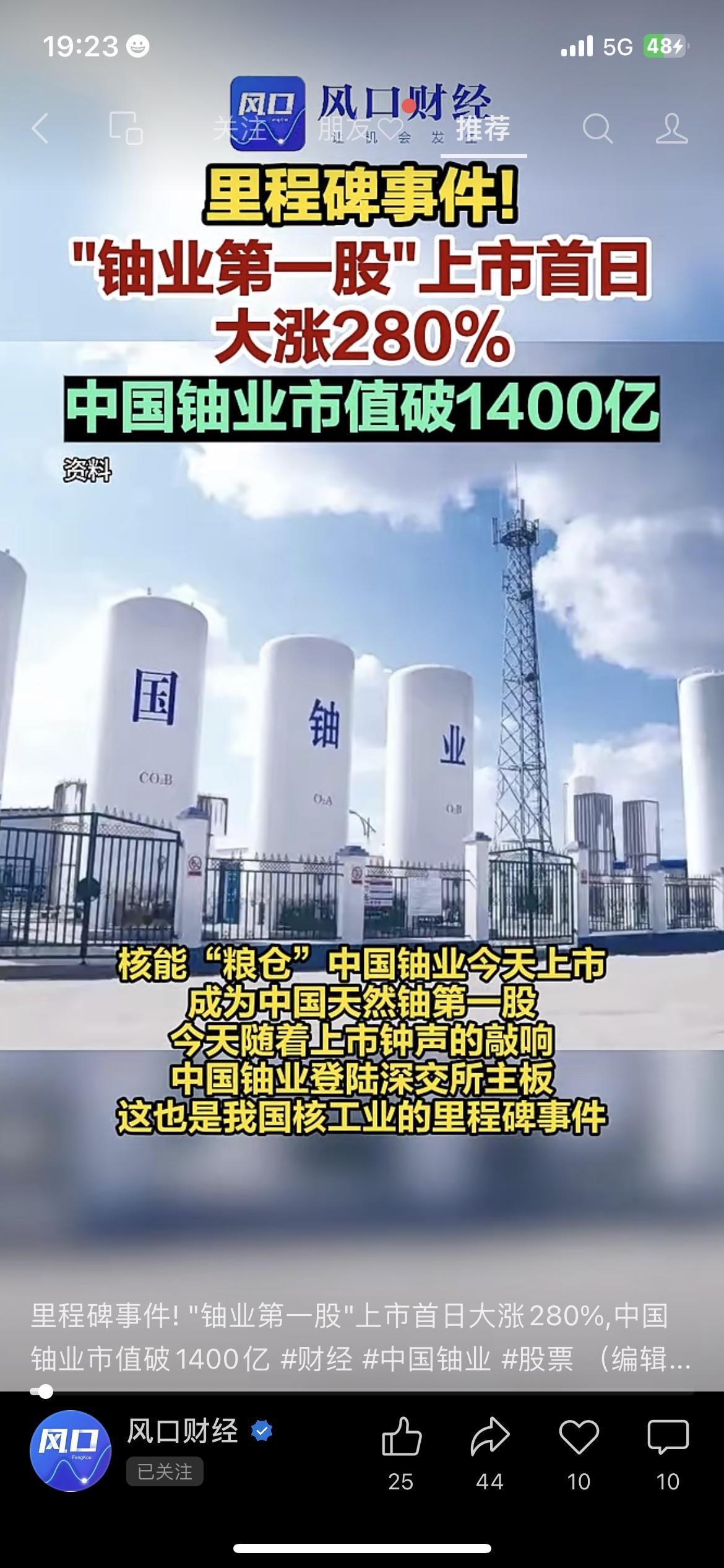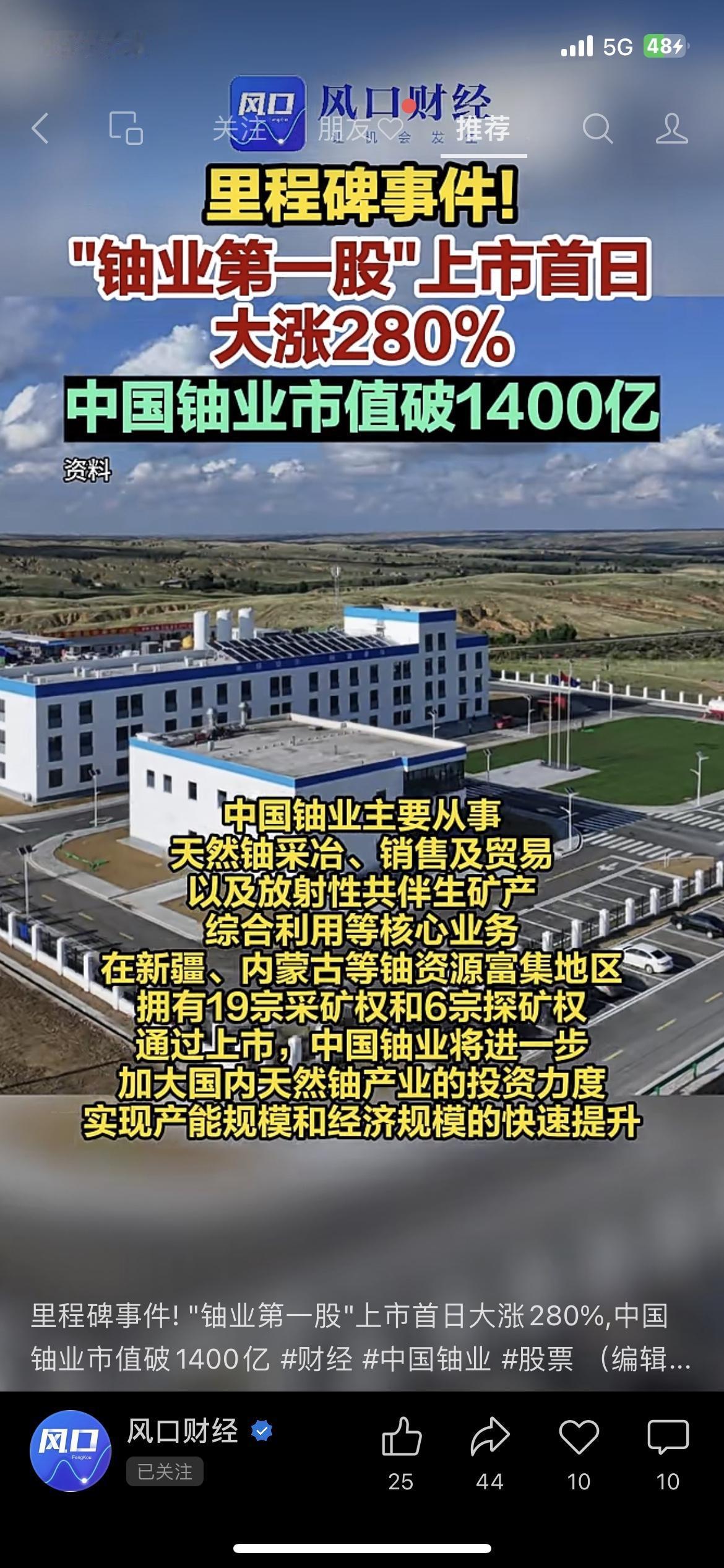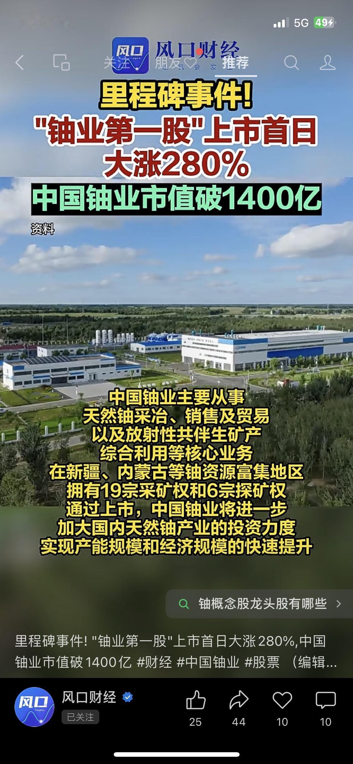 A股炸了!“天然铀第一股”上市涨345%,市值1400亿,手握19个采矿权! 12月3日A股出王炸!中国铀业上市首日最高涨345%,收盘市值超1400亿,成了“天然铀第一股”! 这公司太硬核,手握19个采矿权+6个探矿权,还控股全球第六大铀矿山,掌握第三代地浸采铀技术,业绩连续三年年均涨28%。现在核电大热,它作为上游龙头,被机构疯抢! 你们觉得这波新能源上游行情能持续吗?会跟风布局吗?评论区说说! 中国铀业 A股爆款