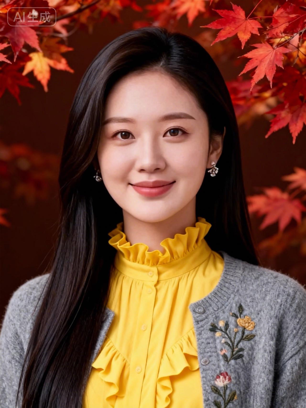 秋日暖阳下的甜美女,红叶背景下的温柔微笑。