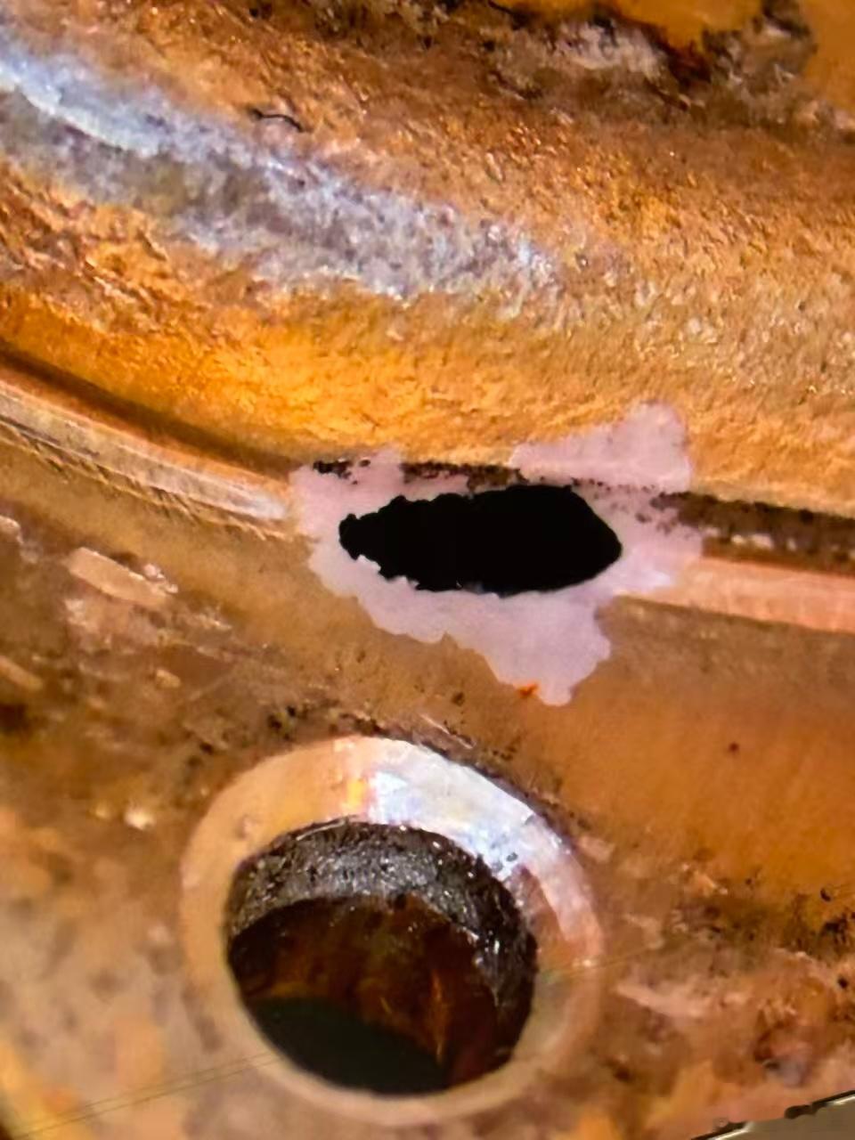 从图片来看应该是电机冷却液防腐这一块没做好导致的,锈穿了。车评精选汽场全开懂车老王 其实电机水道通常是铝合金材质,冷却液需要靠缓蚀剂硅酸盐和有机酸之类的东西加进去 在金属表面形成钝化膜来防腐蚀。一旦保护失效,就会出现你看到的穿孔,原因可能有很多,电化学腐蚀,冷却液没有加去离子水里面的氯离子过剩,或者缓腐蚀添加剂耗尽。