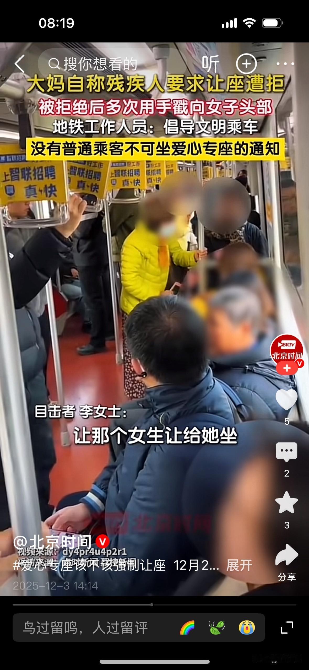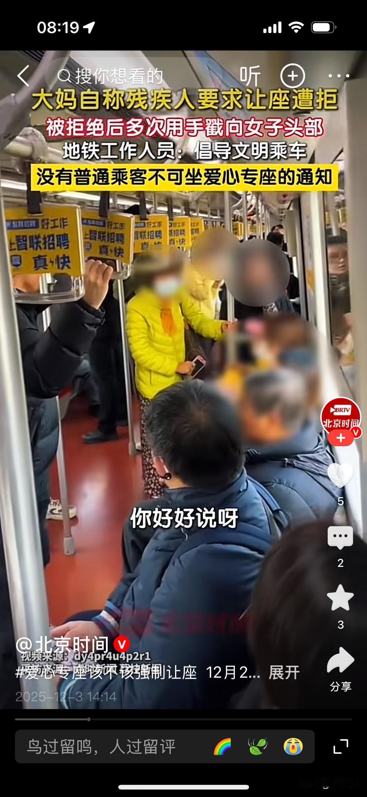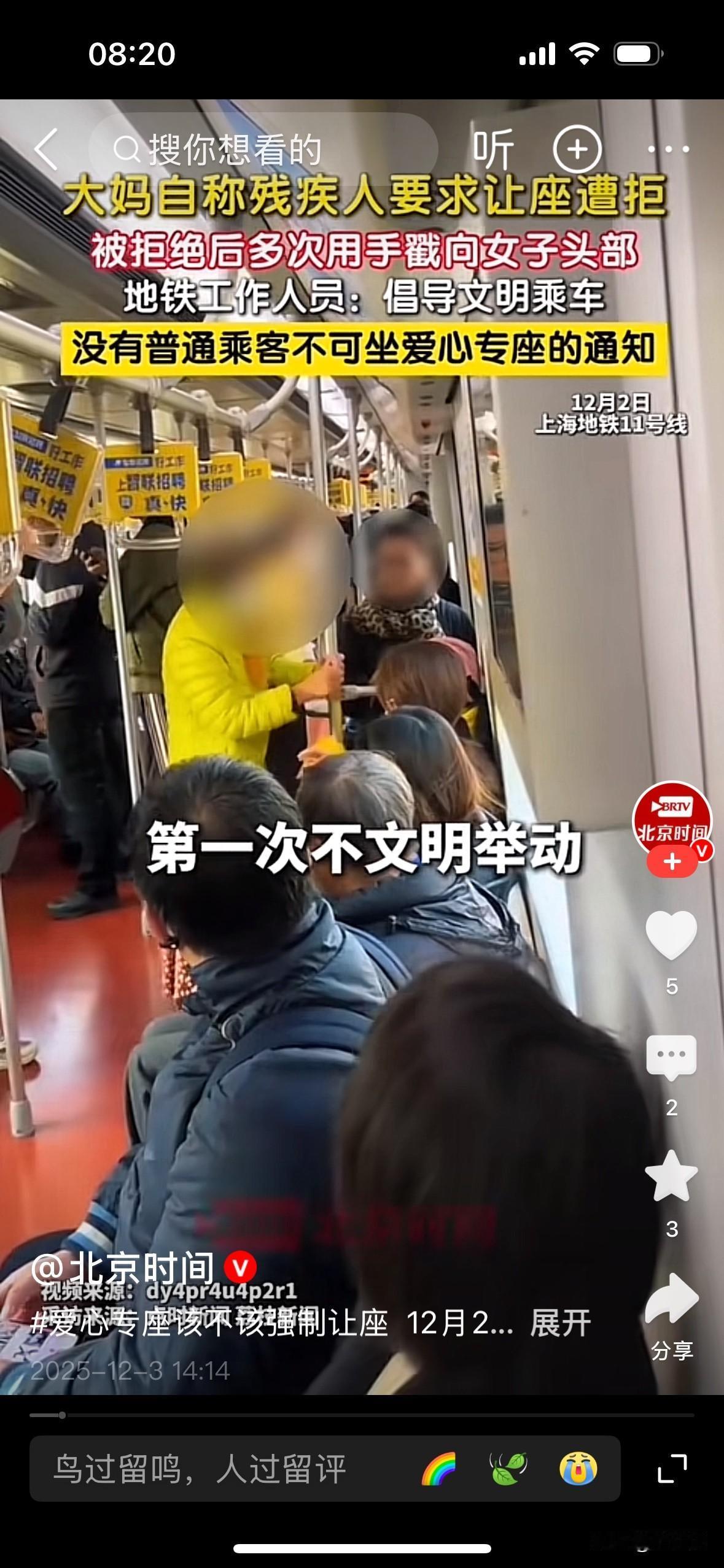 [微风][彩虹]上海地铁老太掀女孩帽子要爱心座!北京北漂30年,我懂年轻人通勤的累 在北京北漂近30年,从结婚带老大扎根到如今,除了零碎回老家的不到一个月,我几乎见证了北京公交地铁的变迁。 作为通勤主力,那些挤地铁的日子,至今想起来都历历在目。 北京太大了,以前靠公交,后来地铁成网,出行是方便了,但早晚高峰的拥挤,只有经历过的人才懂。 高知群体不少都不爱开车,一来公交地铁四通八达,二来停车贵又费劲,地铁自然成了刚需。 白天忙了一天的年轻人,下班只想在地铁上抢个座歇会儿,那种累到不想说话的滋味,真不是矫情。 最近老人动手要求女孩让出地铁爱心座 冲上热搜,看完整件事心里挺不是滋味——这事发生在上海地铁11号线早高峰,老太要求女生让出爱心座,女生说“我也很累”拒绝后,老太激动地伸手掀女孩帽子,现场不少乘客都忍不住发声劝阻。 这让我立刻想起之前北京地铁亦庄线的类似纠纷:晚高峰车厢里,加完班的女孩刚坐下,就被老人要求让座,解释自己工作十多个小时身体不适,反倒遭了掌掴,老人家属还拿“精神状况不稳定”推脱责任,最后只赔了一百元。 其实不管是北京还是上海,城市里主动让座的频率都特别高。 我就有过尴尬的经历——穿了条宽松的韩版裙子,被人误以为怀孕,好几次都有人主动让座,后来我都不敢穿那条裙子出门,怕辜负了别人的好意。 不是说爱心座不该让给老人,而是觉得,老年人出行完全可以灵活安排。 避开早高峰7-9点、晚高峰5-7点,选9点后再出门办事,既能享受宽松的车厢,也不用跟辛苦上班的年轻人“抢座”。 之前北京还有65岁老人在10号线因让座纠纷,用拐杖袭扰女子被行拘的新闻,上海也出过大爷拉拽小伙要求让座的事,真没必要闹到违法或难堪的地步。 我们越老越该爱护自己、尊重别人,用行动引导年轻人相互理解,矛盾自然就少了。 年轻人上班的累,工种不同滋味各异,有的久坐办公室腰酸背痛,有的跑外勤腿都抬不起来,没准想坐着歇会儿的年轻人,本身就身体不舒服。 不管是上海地铁还是北京地铁,都明确过爱心座是“优先使用”,现行法规里并没有强制让座的规定。 和谐社会从来不是单方面的付出,而是你体谅我的奔波,我尊重你的年长。 不管是北京的地铁,还是上海的车厢,每天都在上演着人情冷暖。 让座是美德,但不是义务;敬老值得提倡,但不能变成“道德绑架”。 愿我们都能多一份换位思考,让爱心座真正成为温暖的存在,而不是矛盾的导火索。 记录我的2025