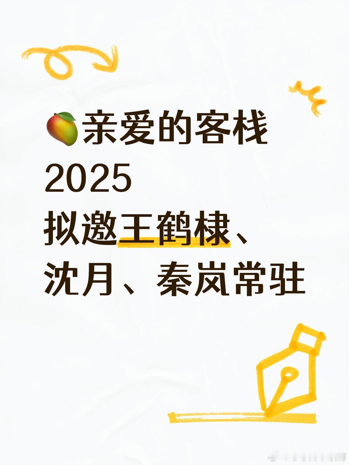 拟邀王鹤棣、沈月🥭亲爱的客栈2025亲爱的客栈2025常驻嘉宾:王鹤棣、秦岚、沈月 等(拟邀)以“归宿”为年度灵魂,开启一场回归生活本真的田园牧歌实验。由一位大哥主理人携四位兄弟合伙人共同经营一田园自然乌托邦,以“未完成田园诗”隐喻持续浪漫,去呼应“慢下来,去生活”的命题。节目邀请跨越青葱爱恋至白首相伴的多年龄段恋人CP入住,在种菜饲禽的真实劳作中,体验爱情在时光绵延里的浪漫进化。沈月‖秦岚‖王鹤棣‖亲爱的客栈