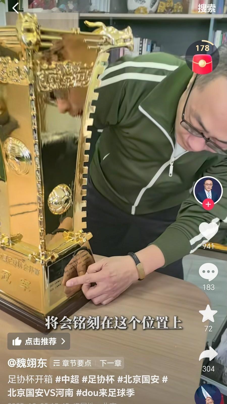 北京国安足协杯提前开香槟? 《天天体育》节目主持人、北京国安体育解说员魏翊东打开了电视台箱子里的足协杯冠军奖杯,并称这是真品。 并且数了上边北京国安夺得足协杯的次数,表示国安最近一次足协杯夺冠是2018年,决赛战胜了山东泰山队,那么2025年会刻上谁的名字呢? 这种是不是属于提前开香槟,感觉有些迫不及待了。北京国安