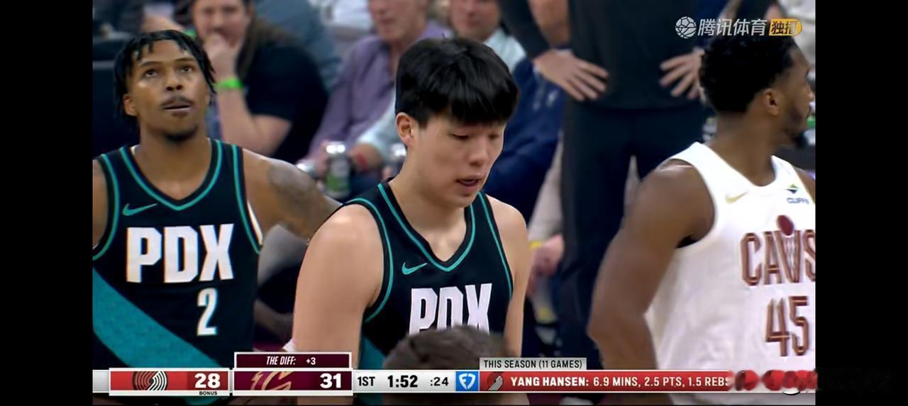 杨翰森首节就上场!上场就反超比分!斯普利特终于找到使用杨翰森的密码! 开拓者醒悟了!球队目前首要任务培养杨翰森,为罗威离队做准备! 首节5分18秒,开拓者队换人,杨瀚森上场,换下克林根! 杨瀚森上场就有贡献!数据提现不出来的贡献! 杨翰森连续的戈塔特掩护,不急着进攻,做好防守,在场正负值高达+5! 杨翰森现在打的跟以前完全不一样了!效果出奇的好! 上场5分钟,虽然没有投篮,但得到2分2板1助攻!没有失误!没有犯规! 开拓者首节36比33领先骑士!