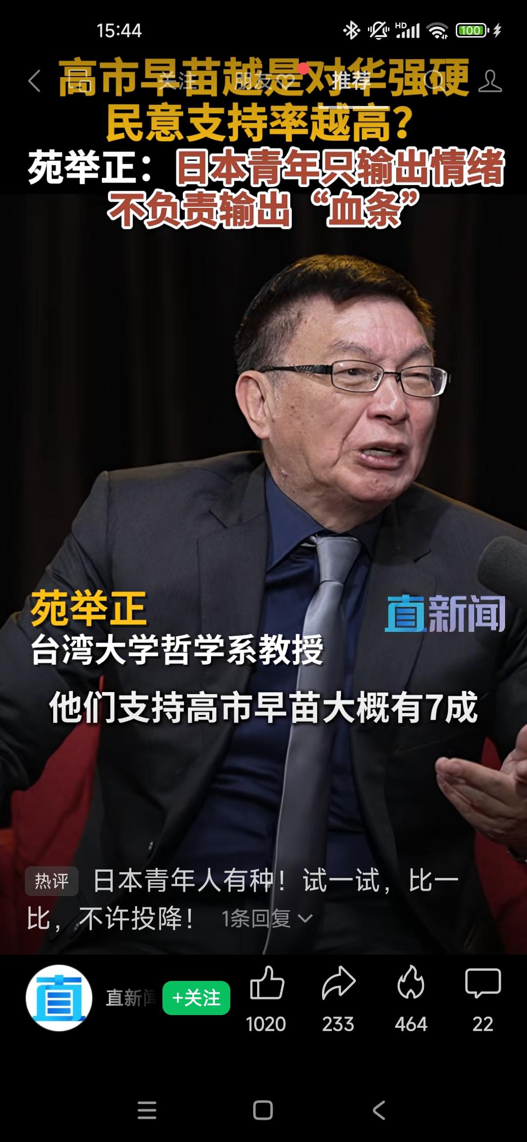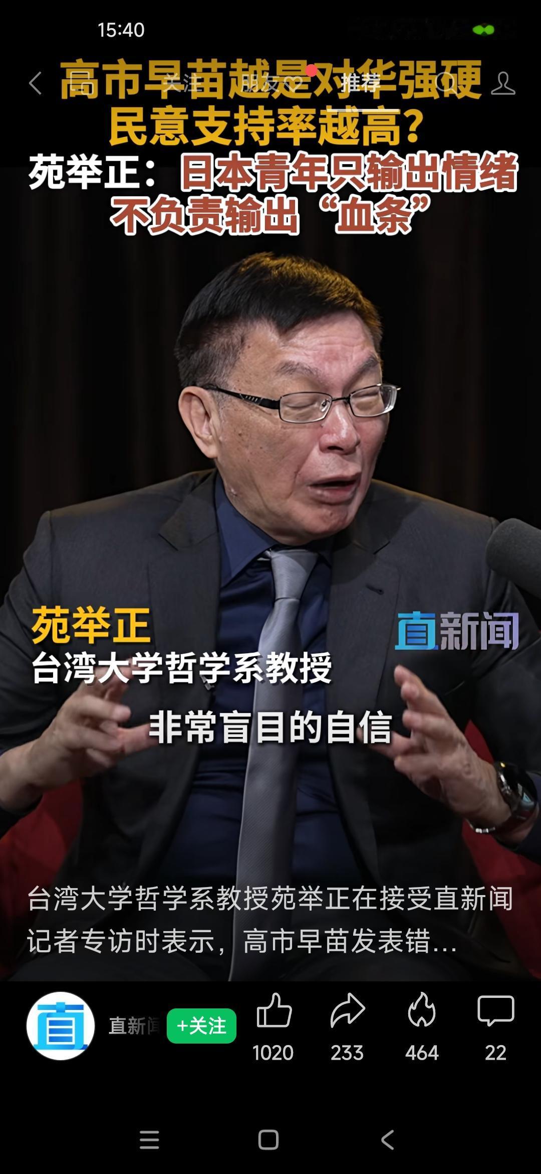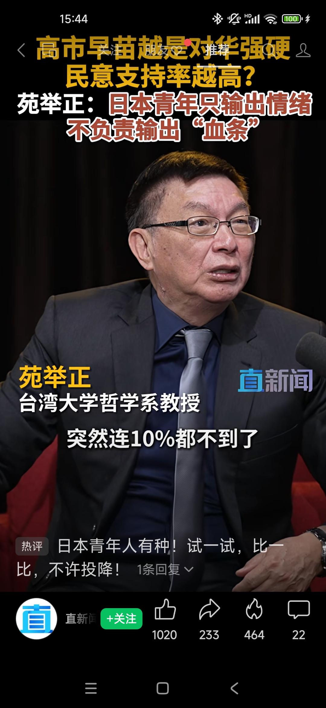 苑举正:日本青年只输出情绪,不负责输出“血条” 苑举证说:日本有很大一批年轻人,他们非常自信,盲目的自信。 高市早苗讲这些话惹怒了中国的同时,她在日本的民意居然是升高的。 这次市调是在18~30岁的年龄范围内,虽然支持高市早苗的有70%,但是被问及是否愿意上战场?结果愿意的只有10%。 中国现在在给日本机会,如果日本提油救火,那么🔥只会越烧越旺,这就是现在的情况。 大家觉得呢?