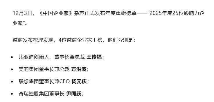 12月3日,《中国企业家》杂志正式发布年度重磅榜单——“2025年度25位影响力企业家”。 4位徽商企业家上榜,他们分别是: • 比亚迪创始人、董事长兼总裁 王传福; • 美的集团董事长兼总裁 方洪波; • 联想集团董事长兼CEO 杨元庆; • 奇瑞控股集团董事长 尹同跃;