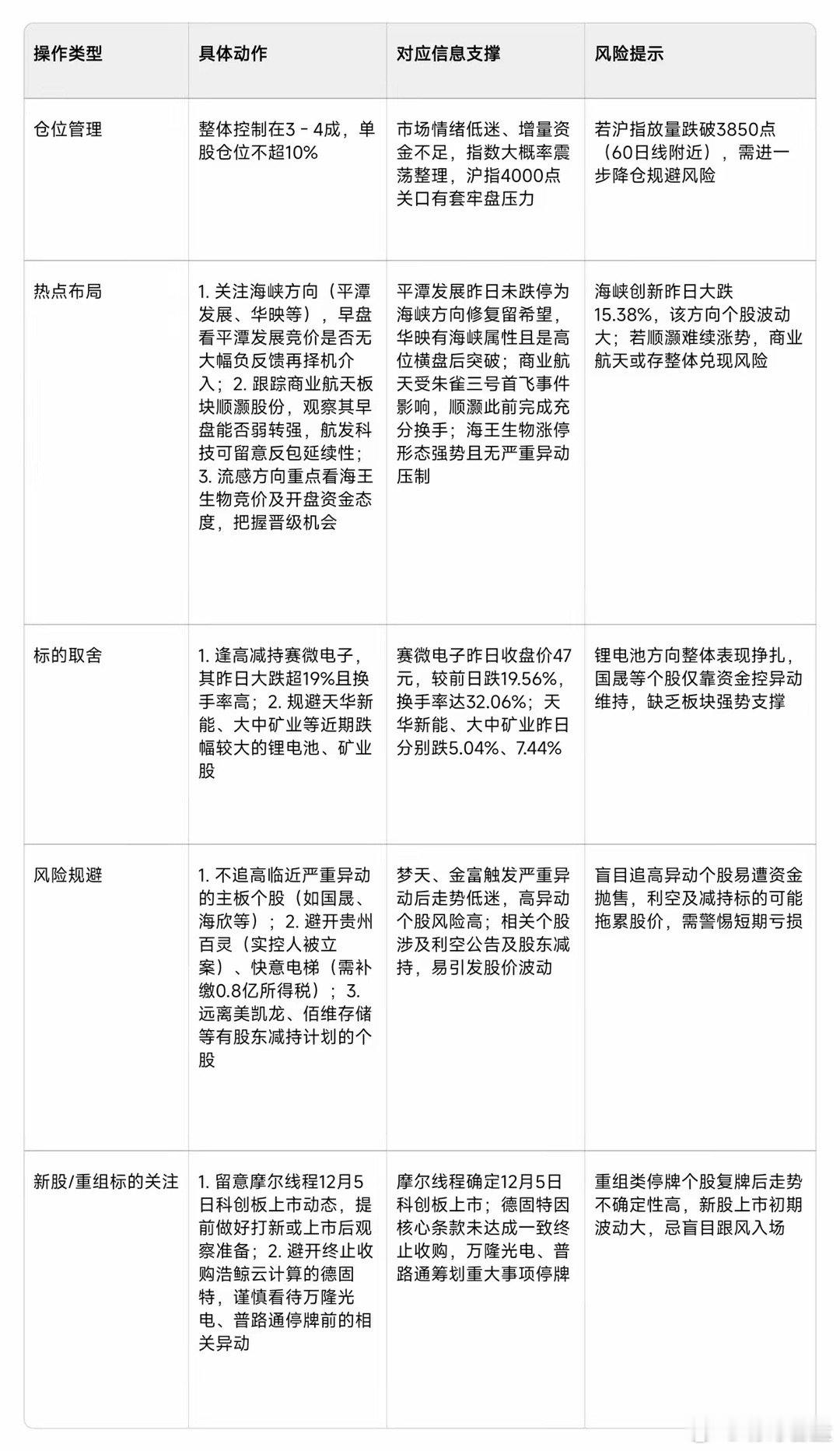 2025年12月4日A股盘前信息和上市公司重要公告的分类汇总摘要一、2025年12月4日A股盘前信息分类汇总摘要1. 市场整体预判隔夜美股道指涨0.86%,纳指微涨0.17%,伦铜创历史新高至11540美元/吨,纽约黄金报4236美元/盎司;离岸人民币升值至7.0524,在岸人民币收7.0640,美联储降息概率升至90%,外资或持续流入人民币资产。A股日内大概率呈震荡整固格局,指数或在窄区间拉锯,早盘或下探后有抄底资金进场,尾盘小幅回暖;操作建议保持5-6成中性仓位,忌追高热门题材。2. 板块风向走强板块:煤炭(旺季需求)、有色金属、风电设备等防御性周期板块,以及半导体、军工(主力资金低吸);可关注高股息蓝筹+AI产业链/半导体的哑铃型配置。承压板块:锂电池、AI应用、传媒、计算机等高估值热门赛道(资金获利回吐)。3. 重要外部/政策因素美联储降息预期强烈,美元走弱利好新兴市场;国内稳增长政策持续落地,但需警惕科技股获利盘回吐及金融数据不及预期的风险;富时罗素12月19日将调整A股相关指数,涉被动资金配置。二、2025年12月4日A股上市公司重要公告分类汇总摘要1. 停牌/上市类停牌:万隆光电(筹划收购中控信息控制权,涉重大资产重组)、普路通(筹划发行股份购Le­q­ee Gr­o­up控制权)。上市:摩尔线程12月5日科创板上市。2. 资产重组/投资类赛微电子子公司拟6600万元参设初芯微科技(持股30%);德固特终止收购浩鲸云计算100%股份(核心条款未达成一致);天沃科技拟19.18亿元建光热+风电一体化项目;精工科技中标7.29亿元碳纤维项目(占2024年营收40%)。3. 大额订单类重庆建工联合体中标两基建项目,承建体量合计19.75亿元;中铝国际子公司联合中标30.3亿元电解铝项目。4. 股东增减持类减持:美凯龙股东拟减持不超3%股份;佰维存储大基金二期已减持0.9955%股份;山西汾酒二股东减持1.33%股份完成;腾景科技、唯赛勃等多家公司股东披露减持计划。5. 风险警示类贵州百灵实控人姜伟因涉嫌内幕交易等被证监会立案(不影响公司经营);快意电梯被取消高新企业资格,需补缴0.8亿所得税,或拖累全年净利润。以上内容根据公开资料整理仅供参考。股市有风险,投资需谨慎。