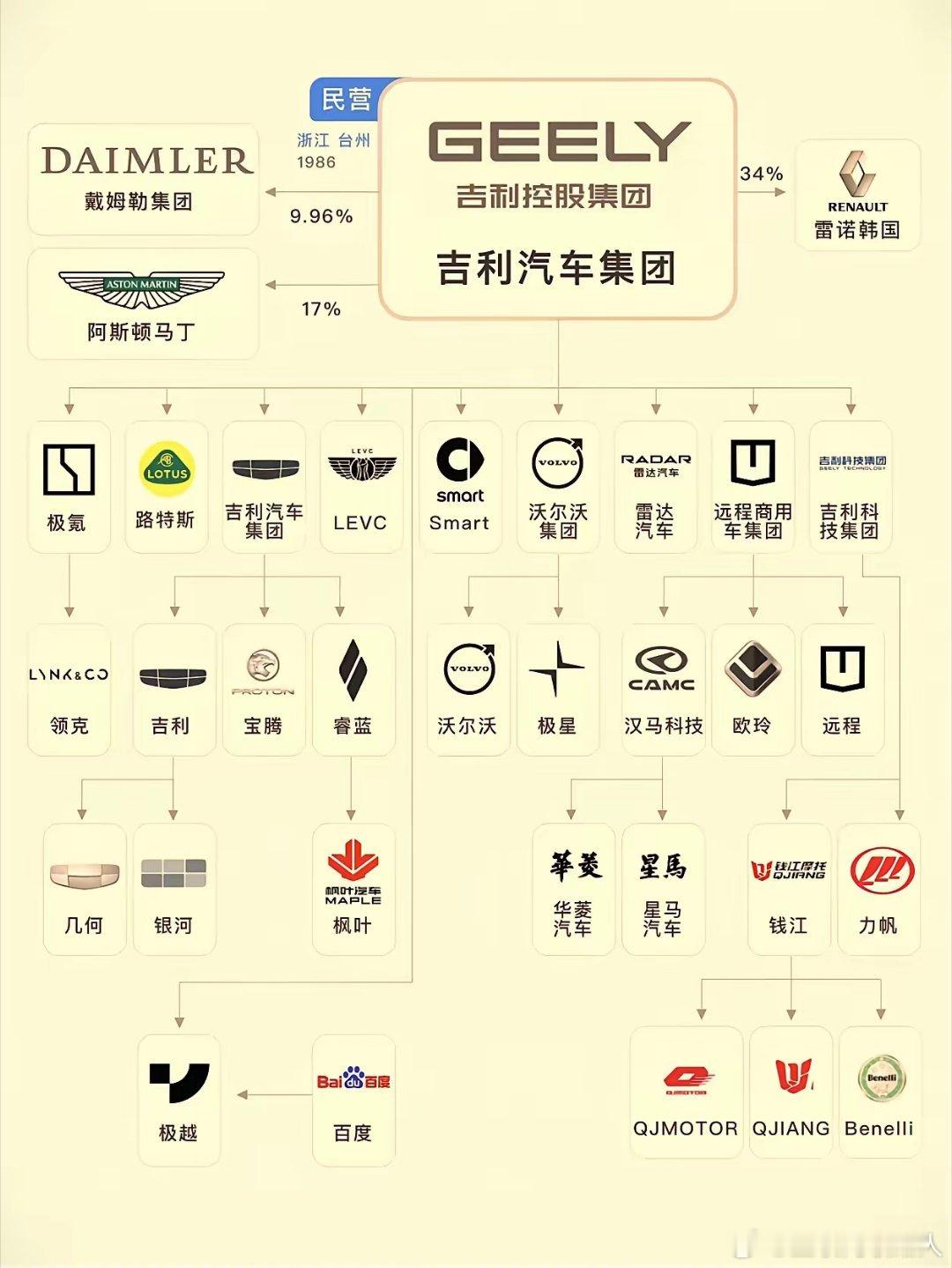 原来五常车企里面,奇瑞和长安是国央企,其余三家都是民企比亚迪和长城的框架还算简单,吉利等车企的框架则明显复杂得多,难怪有时不少人认不出背后的车企。包括一些豪车,也由国产品牌控股,比如奇瑞旗下的捷豹路虎,吉利控股的沃尔沃、路特斯以及奔驰等。广汽基本以合资为主,一汽停产车型较多,上汽通用多