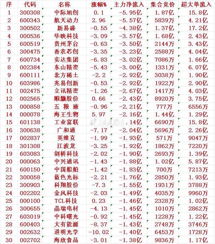 12月4日开盘45分钟,主力资金“卖出的 ”30名单!中际旭创:净流入 -5.95亿元航天动力:净流入 -5.57亿元新易盛:净流入 -4.38亿元华映科技:净流入 -3.57亿元贵州茅台:净流入 -3.50亿元