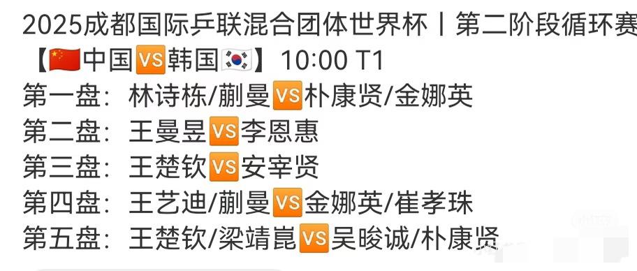 成都混团世界杯第二阶段 中国VS韩国 孙颖莎没上场 第一盘 林诗栋/蒯曼VS朴康贤/金娜英 第二盘 王曼昱VS李恩惠 第三盘 王楚钦VS安宰贤 第四盘 王艺迪/蒯曼VS金娜英/崔孝珠 第五盘 王楚钦/梁靖崑VS吴俊诚/朴康贤 今天莎莎轮休, 不上场, 王艺迪首次上场, 申裕斌,张禹珍不上场 一定是留一手, 估计是保存实力, 和日德PK! 反正也赢不了, 不如锻炼一下新人! 徐瑛彬还是没有给安排上, 王曼昱加油, 王楚钦加油! 动漫加油! 大迪加油👏……