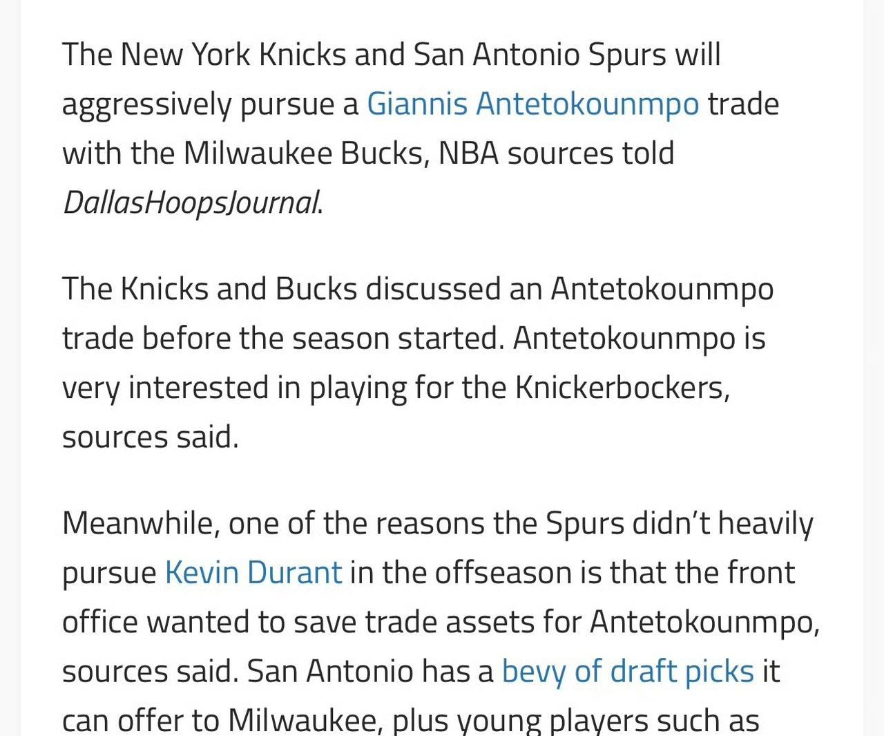 《达拉斯篮球日报》记者Ashish Mathur: 消息人士透露,尼克斯与马刺将积极推动关于字母哥的交易。 尼克斯与雄鹿在赛季开始前就已商讨过交易字母哥的交易,字母哥本人对为尼克斯效力非常感兴趣。 与此同时,消息人士表示,马刺休赛期没有全力追求杜兰特的原因之一,是管理层希望保留交易资产用于追求字母哥。马刺有大量选秀权可以给雄鹿,此外还有瓦塞尔、小哈珀和卡斯尔这样的优质年轻球员。