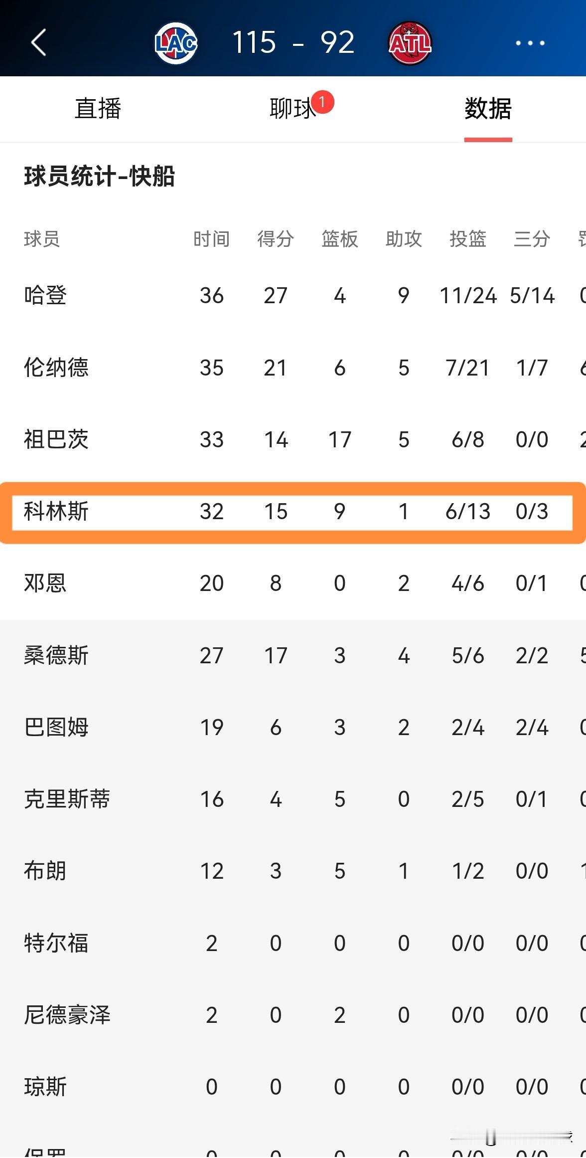快船大将科林斯真是太不懂事了!在今天快船客场以115:92大胜老鹰的比赛中,科林斯面对老东家丝毫不念旧情,他在攻防两端都打得非常强硬。 全场比赛下来,科林斯首发出战32分钟,投篮13中6,其中罚球3中3得到15分9篮板2抢断1盖帽,他的场上正负值为+24。 说实话,如果没有老鹰当初的精心培养,科林斯绝对不会如此的出色,可是今天科林斯却向老东家痛下杀手了。