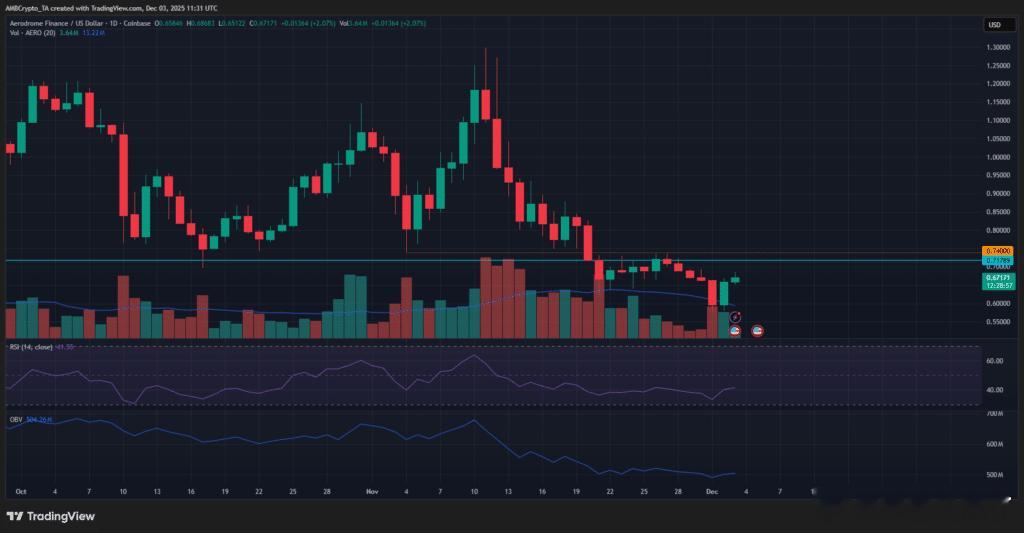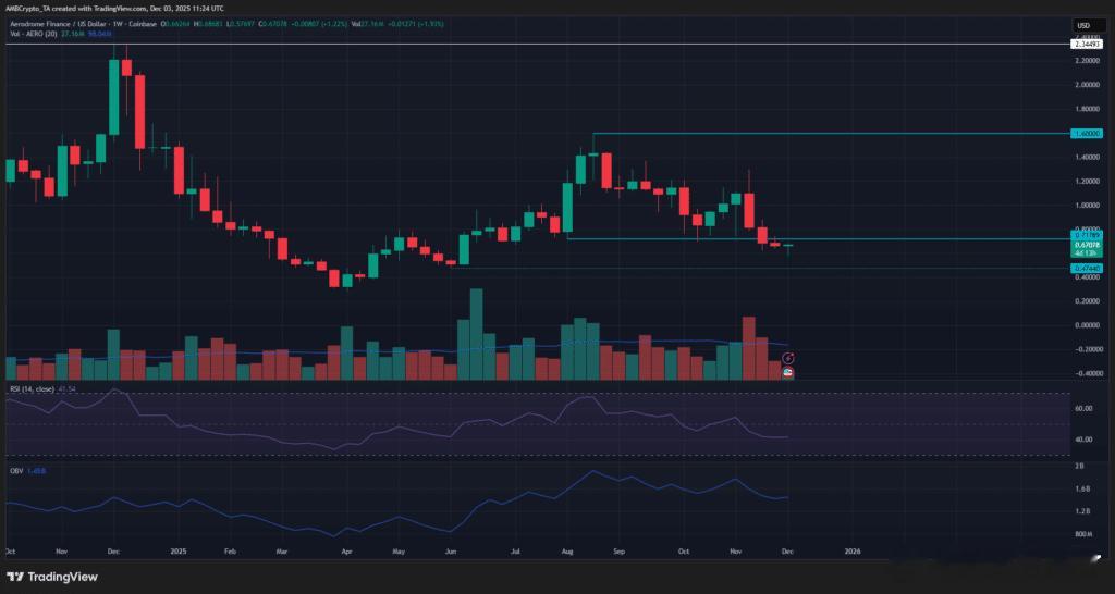 Aerodrome Finance (AERO ) 和 Velodrome Finance 合并成立了 Aero 公司,这本应是个大新闻,尤其是在 Base 和 Optimism 上的交易协议合并。不过,市场并没太买账,AERO 的价格依旧偏弱。11 月以来,高时间框架图表显示 AERO 持续下跌,短期目标价 0.82 美元和 0.74 美元都已经被空头踩过,长期支撑位在 0.474 美元。周线图和日线图都指向看跌趋势,RSI 和 OBV 指标确认了抛售压力,价格不断创出更低的高点和低点。唯一可能的转机,是价格突破 0.74 美元并伴随高成交量和比特币行情配合,这才有机会看到反弹。当前市场更可能的情况仍是 AERO 下行,如果重新测试 0.7–0.75 美元区域,做空机会可能出现,下一个支撑看向 0.474 美元。总体来看,除非市场情绪和比特币反弹同步改善,否则 AERO 的价格短期内仍偏弱,交易者需保持谨慎。区块链山寨币