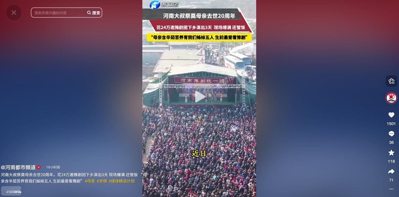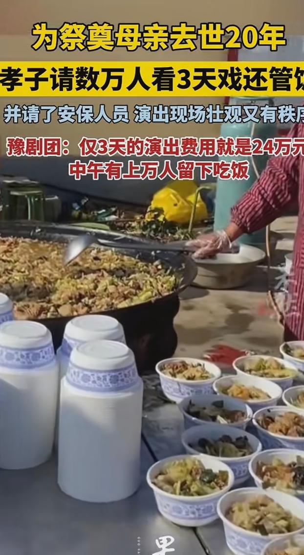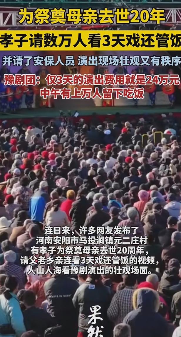 河南安阳,一男子为祭奠母亲去世20年,不但大操大办,请数万父老乡亲免费看戏3天,中午还管饭,吃的还相当不错,演出每场就40000元,一共6场共24万,还雇保安维持秩序。可网友不买账:死了20年摆阔不是孝,孝不是做给别人看的,是靠平时用心去做的。 最近河南安阳的一个村子可太热闹了,那阵仗别说赶上赶集,甚至比过年还要红火几分,村里的大广场上,连续三天三夜锣鼓声就没断过,密密麻麻的小马扎摆了一片,几万乡亲围坐在一起,都仰着头看得津津有味。 但这不是官方组织的文化下乡活动,也不是谁家办大寿的排场,而是当地一名男子为了祭奠母亲去世 20 周年,特意给父老乡亲们办的一场特殊纪念活动。 这场活动之所以在网上引发了不小的争议,核心就是那笔让人咋舌的开销,据了解为了让这场纪念活动有足够的排面,这名男子专门请来了河南豫剧院一团的顶级名角,单场演出的出场费就高达 4 万元,整整连演 6 场,光演出费用就花出去 24 万元。 不仅如此他还敞开大门,让十里八乡的乡亲们都来免费看戏,中午还管一顿相当不错的午饭,现场人太多,不得不专门雇了保安来维持秩序,防止出现拥挤踩踏的情况。 如此大的手笔很快就在网上掀起了讨论,不少网友并不买账,纷纷提出质疑,有人直言母亲都已经去世 20 年了,现在搞这么大排场,分明就是在摆阔气,根本不是真孝顺。 还有人觉得孝顺从来都不是做给外人看的,要是真有心,不如在老人活着的时候多尽尽孝,多给老人端几碗热汤、添几件衣裳,总好过死后花大价钱搞这些表面功夫,不知道的还以为是借着祭奠母亲的名头给自己挣脸面。 不过要是抛开这 24 万的花销,仔细琢磨这件事的来龙去脉,就能发现其中藏着的情义,其实远比金钱本身更值得说道。 这名男子的 “豪横”,从来都不是暴发户式的盲目撒钱,而是带着实打实的用心,他的母亲这辈子过得格外苦,9 岁就成了孤儿,39 岁又失去了丈夫,一个人咬着牙把 5 个孩子拉扯成人。 在过去那个缺衣少食的艰难岁月里,听豫剧是老母亲这辈子唯一的精神寄托,也是她为数不多能感受到快乐的时刻,如今儿子有了能力,既没搞豪车巡游的虚头,也没弄纸扎成山的俗套,而是专门把母亲生前最爱听的《朝阳沟》《穆桂英挂帅》这些经典剧目,请到了家门口的广场上。 当豫剧的唱腔在村子上空响起时,这早已不只是一场普通的演出,更像是儿子跨越 20 年的时光,为母亲圆的一个未了心愿,而且这场热闹的背后,还藏着乡村里最朴素的乡情逻辑。 在农村一个人出息了,最体面的事从来不是在城里买了多少套房、开了多好的车,而是记不记得当年帮衬过自己的乡亲,想当年他们家孤儿寡母日子难以为继的时候,村里的邻居没少伸手帮衬,今天送一把米,明天递一瓢面,才让他们熬过了最难的日子。 现在男子有了能力,就敞开大门招待乡亲,不管是本村的还是邻村的,只要来看戏,就能吃上热乎的大锅菜、豆沫和馒头,这种带着感恩的回馈,在乡亲们眼里比啥都珍贵。 其实大家没必要纠结这 24 万花得值不值,也别用 “生前尽孝” 来绑架 “身后追思”,孝顺从来没有统一的标准,老人在世时,一碗热汤面是孝,老人走后记着她的喜好,用她喜欢的方式纪念她,同时还能回报当年帮衬过自己的乡邻,这又何尝不是一种深沉的孝。 戏台下是几万张被热饭填饱的肚子,是一双双因为听到名角儿唱腔而笑弯的眼睛,这份烟火气里的满足和温情,远比存折上的数字更有温度。要是老母亲真有在天之灵,看到儿子如今不仅能挺直腰杆过日子,还能把当年的恩情加倍还给乡邻,想必也会打心底里觉得欣慰,这大概就是中国乡村最实在的人情事理,钱是冷的可人情和惦念永远是热乎的。 (信息来源:河南都市频道)
