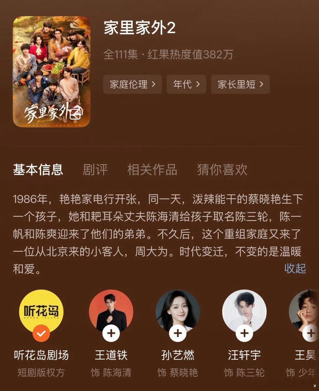 家里家外2王道铁孙艺燃的《家里家外2》已经上了,第一部是大爆剧,不知道第二部能不能延续