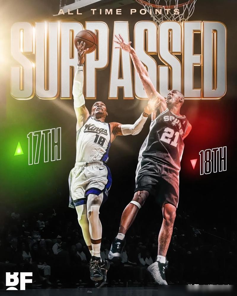 超越邓肯,威少职业生涯总得分升至历史第17位! 在今天国王与火箭的比赛中,威少在半场拿到了8分,职业生涯总得分来到了26497分,超越了邓肯的26496分,排名NBA历史得分榜第17位,在现役球员中仅次于詹姆斯,杜兰特和哈登。 威少距离3万分还差3503分,本赛季场均只有13.6分,这样的话至少还得再打4个赛季才能突破3万分,37岁的威少已经力不从心了。 就是这个看似平淡的两分,让他的职业生涯总得分来到了26497分,正式超越了圣安东尼奥马刺的传奇蒂姆·邓肯,独占NBA历史得分榜第17位的宝座。 此刻,我们谈论的早已不是简单的得分累积。 想想看,一个被贴上“投篮选择糟糕”标签的后卫,硬是凭借着一股永不熄灭的火焰,将自己的名字镌刻在了一众内线巨擘和得分天才之上。 这本身就是对篮球传统认知的一种颠覆。 威少的伟大,恰恰在于他的“不完美”。 他的比赛充斥着激情、失误、高难度投篮,但也正是这种近乎偏执的冲击力,为他赢得了这一切。 超越邓肯,象征意义巨大,这仿佛是两个时代、两种篮球哲学的隔空对话,一位是沉稳如山的基石,一位是奔腾似火的洪流。 然而,将目光仅仅锁定在得分榜上,对现阶段的威少而言是一种巨大的不公。 场均13.6分的数据确实指向一个现实,那个动辄砍下三十分、炸裂篮筐的MVP正逐渐远去。 但看看他的贡献吧,7.1个篮板、6.8次助攻、1.2次抢断。 在萨克拉门托,他早已完成了从超级得分手到球场指挥家的蜕变。 他的价值不再仅仅用得分来衡量,而是渗透在每一次推动反击、每一次精准传球、每一次拼抢篮板的细节之中。 他是这支年轻国王队的引擎和灵魂,这种转型后的成功,远比单纯追逐一个遥不可及的三万分大关更具智慧。 提到三万分,就绕不开那令人唏嘘又无比辉煌的“雷霆三少”。 凯文·杜兰特,一台无情的得分机器,早已跨过三万分门槛。 詹姆斯·哈登,节奏大师,下赛季也触手可及。 唯有威少,似乎注定与这个精英俱乐部无缘。 但这真的意味着失败吗? 绝不。 威少走了一条截然不同的路。 他是历史第二位达成25000分+10000助攻的球员,一座独属于他的“三双”丰碑早已震古烁今。 当人们为杜兰特的死神镰刀和哈登的后撤步魔法喝彩时,威少用他全部的职业生涯诠释了何为“倾其所有”。 他的篮球,是热血、是斗志、是不向岁月和质疑低头的宣言。 或许,我们不该再为他“仅排”历史第17位或是可能无法突破三万分而感到遗憾。 拉塞尔·威斯布鲁克的存在本身,就是一个传奇。 他用自己的方式,重新定义了控卫的可能性,证明了激情与忠诚在商业联盟中的珍贵。 每一分,每一个篮板,每一次助攻,都是他独一无二篮球哲学的注脚。 超越邓肯,不是终点,而是他这曲波澜壮阔生涯乐章中一个铿锵有力的音符,提醒着我们,传奇的样貌,从来不止一种。