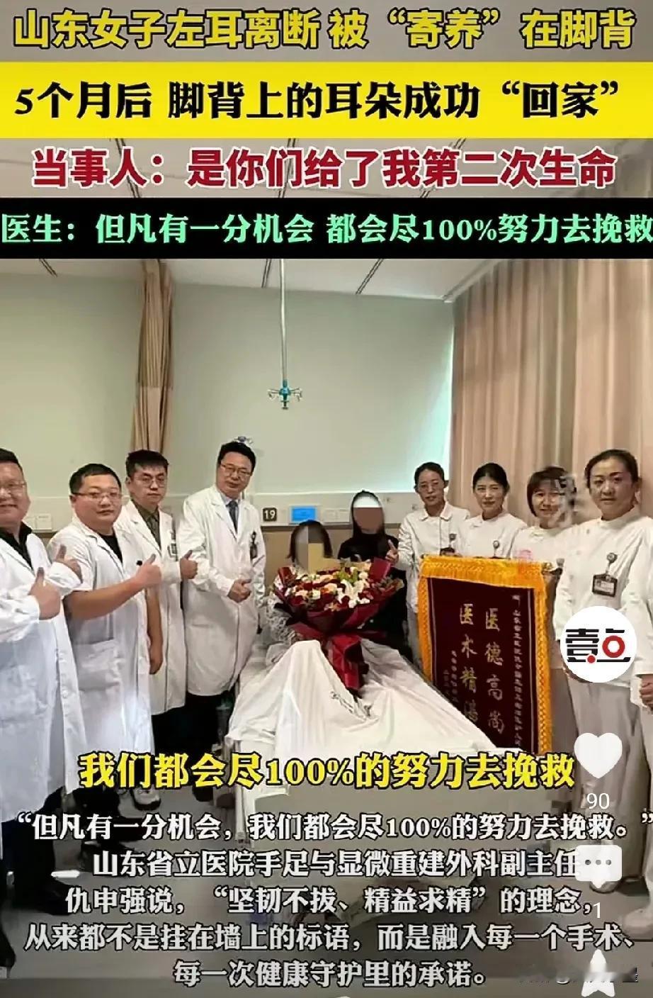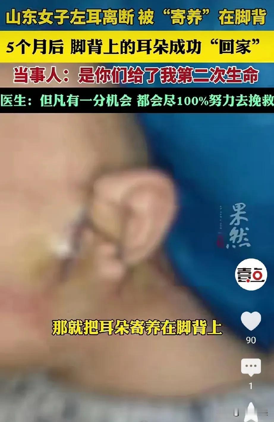 脚背上长了一只耳朵👂,你没有看错,这是真实发生的一件事。山东一位女子因发生意外耳朵掉下来了,她被送到山东省立医院后,现场的专家医生经过会诊后,决定先把这只耳朵放在其脚面寄养,原因是足部皮肤软,组织厚度薄,也能找到与耳朵血管口径的动脉和静脉,培养一段时间,等时机成熟了再移植回去,让其回家! 经过5个多月的寄养后,在医护专家的努力下,通过手术重新回到了自己本来的位置! 术后医护人员说的这句话非常好,但凡有一分机会,都会100%去挽救。 医者仁心!医生是一份非常特殊的职业,付有救死扶伤,治病救人的神圣职责,他们的努力换回的是病人生命的明天!致敬每一位医护人员!