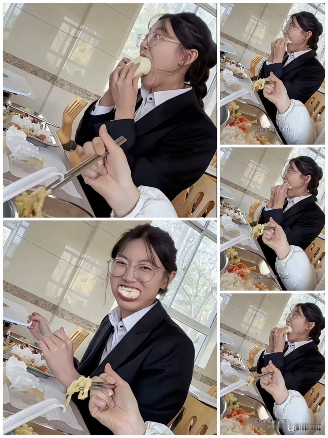眼镜一戴看起来挺斯文的女孩子,没想到一口把那么大的一个馒头塞进了嘴里,如此斯文可爱的女孩子这吃相真是让人大跌眼镜,她就不怕把自己噎着吗? 尽管那馒头是发面做的,但看起来和她的拳头大小差不多,她居然一口就全部塞进了嘴里,塞进嘴里不稀奇,但她如何把那么大一块馒头在嘴里嚼碎?那么大一块在嘴里都回转不过还如何去嚼,难不成她就那样咽下去吗? 这样的女孩子肯定是从小吃馒头长大的,从她的吃馒头的手法看,她平时做事肯定也是果断雷厉风行,或者是从小就把吃馒头的绝活练的无人能比,老话说一口吃不了一个热馒头,这女孩子不是一口把一个馒头吃进嘴里了吗?