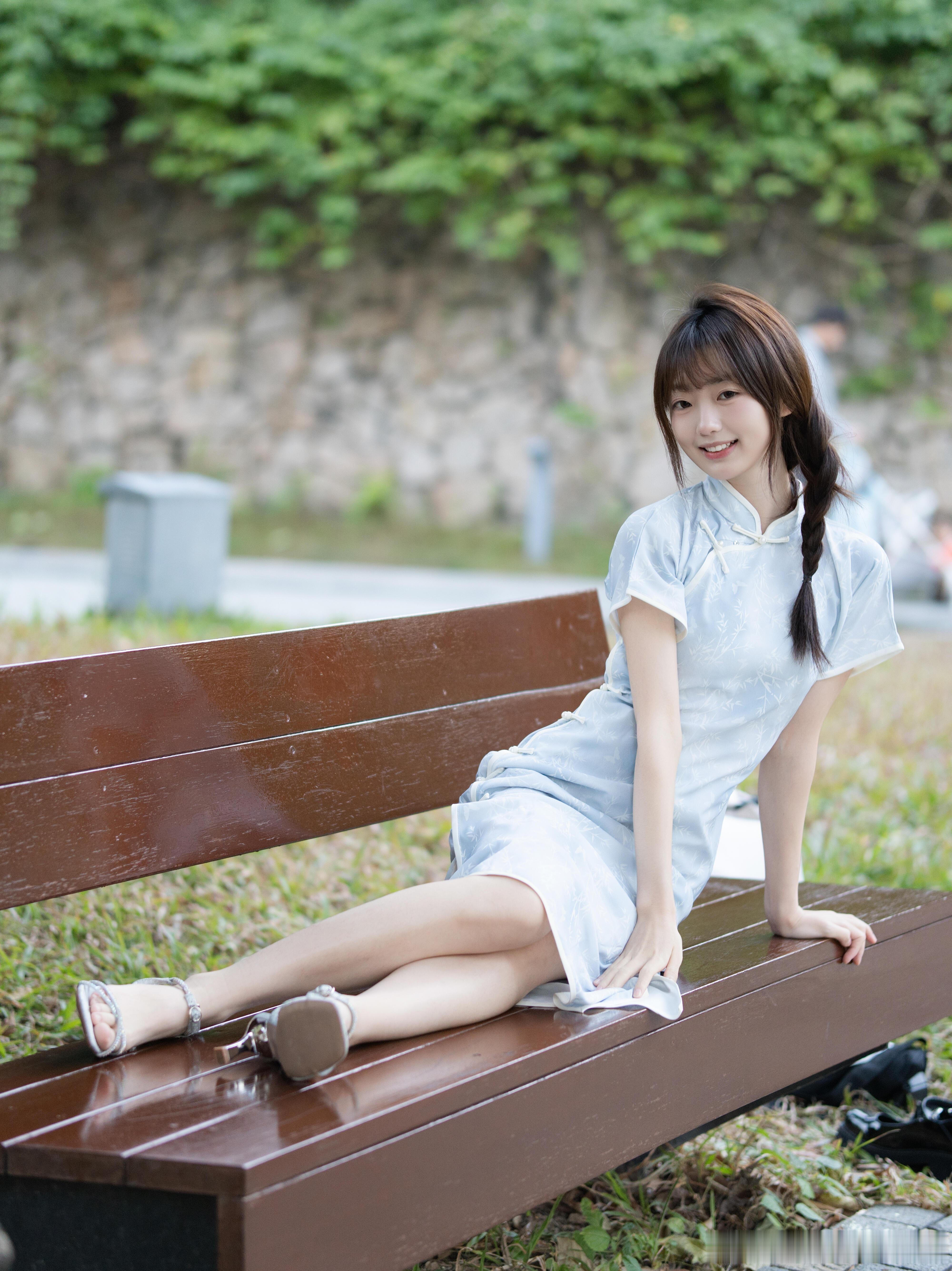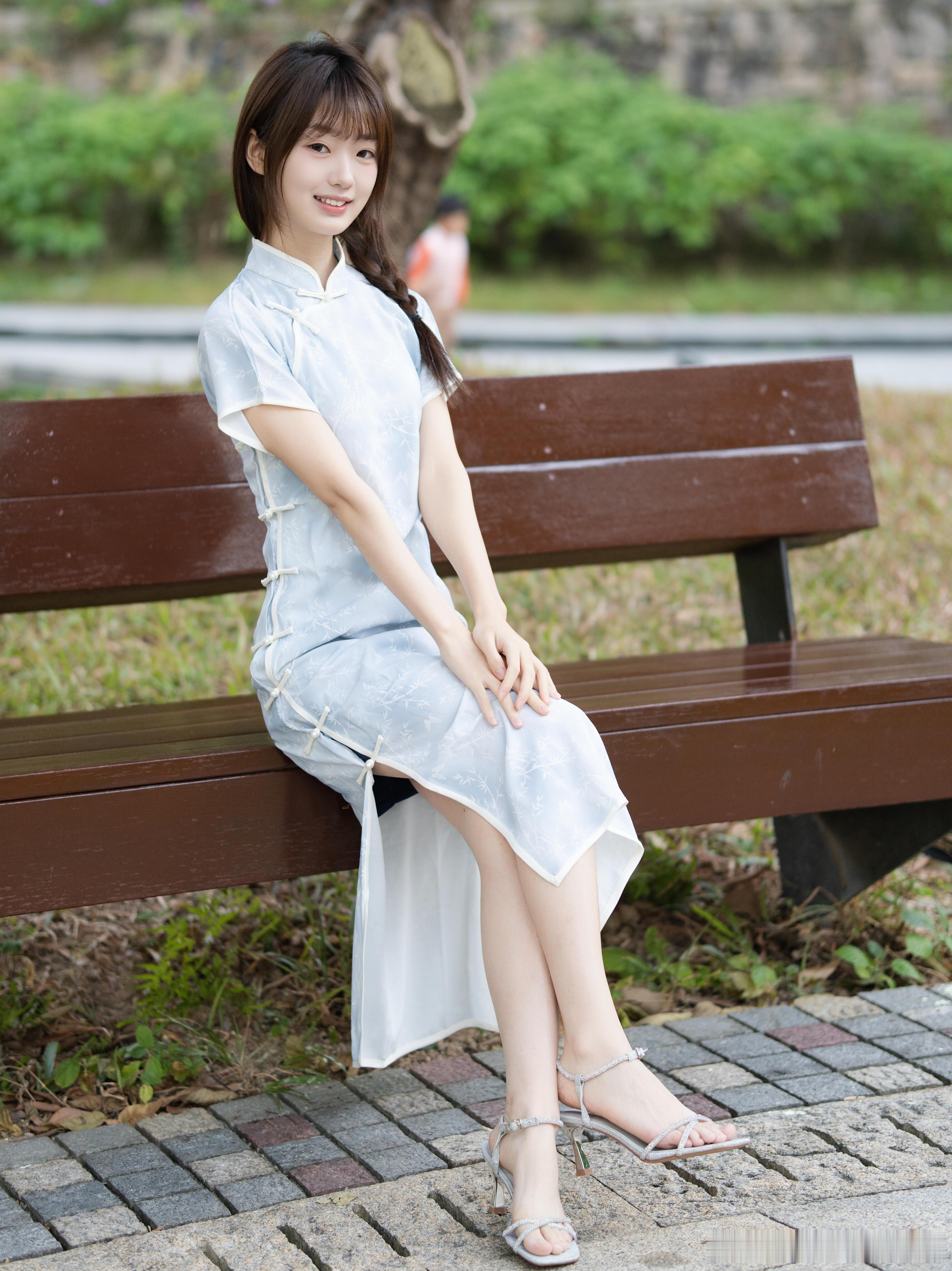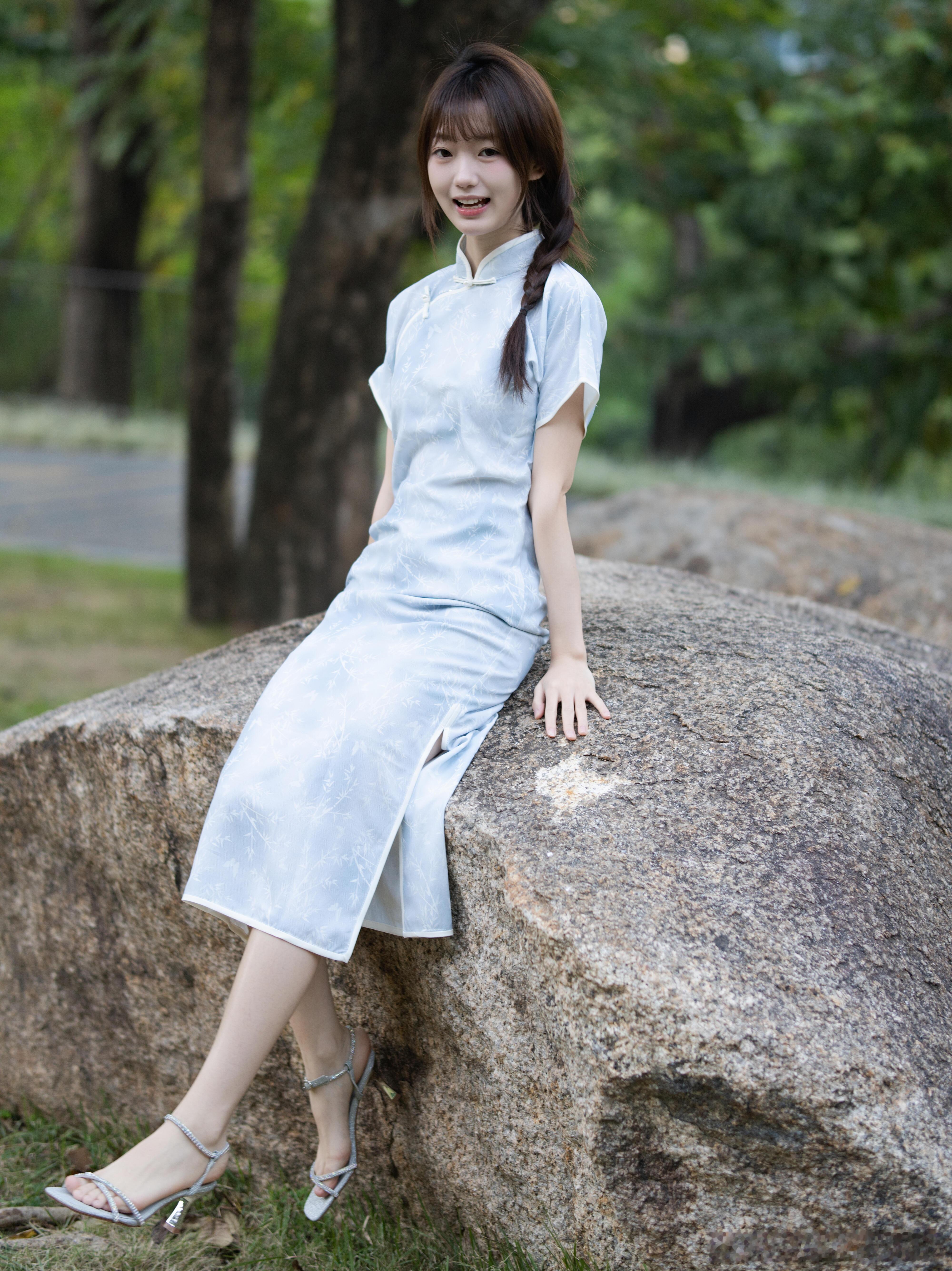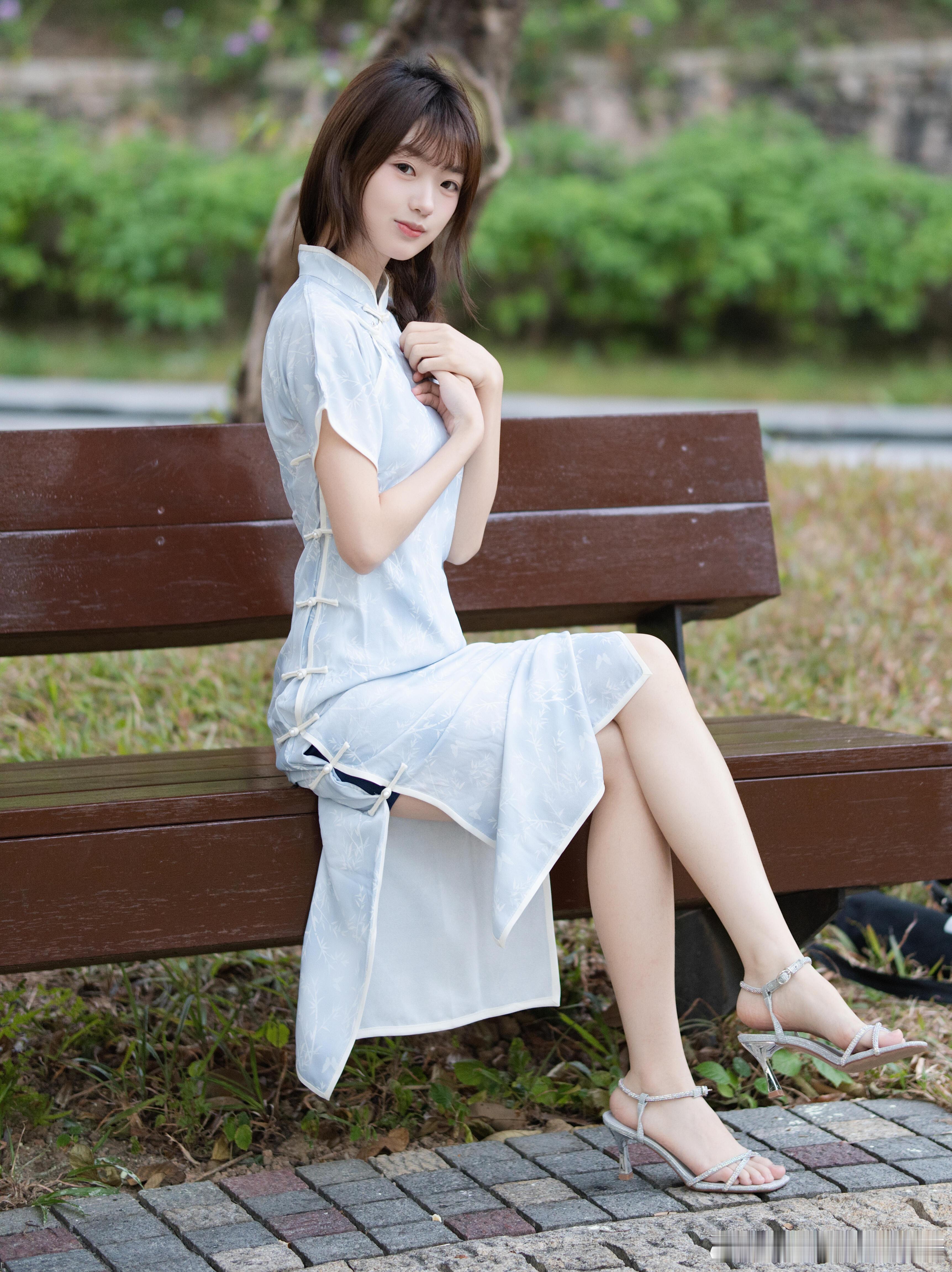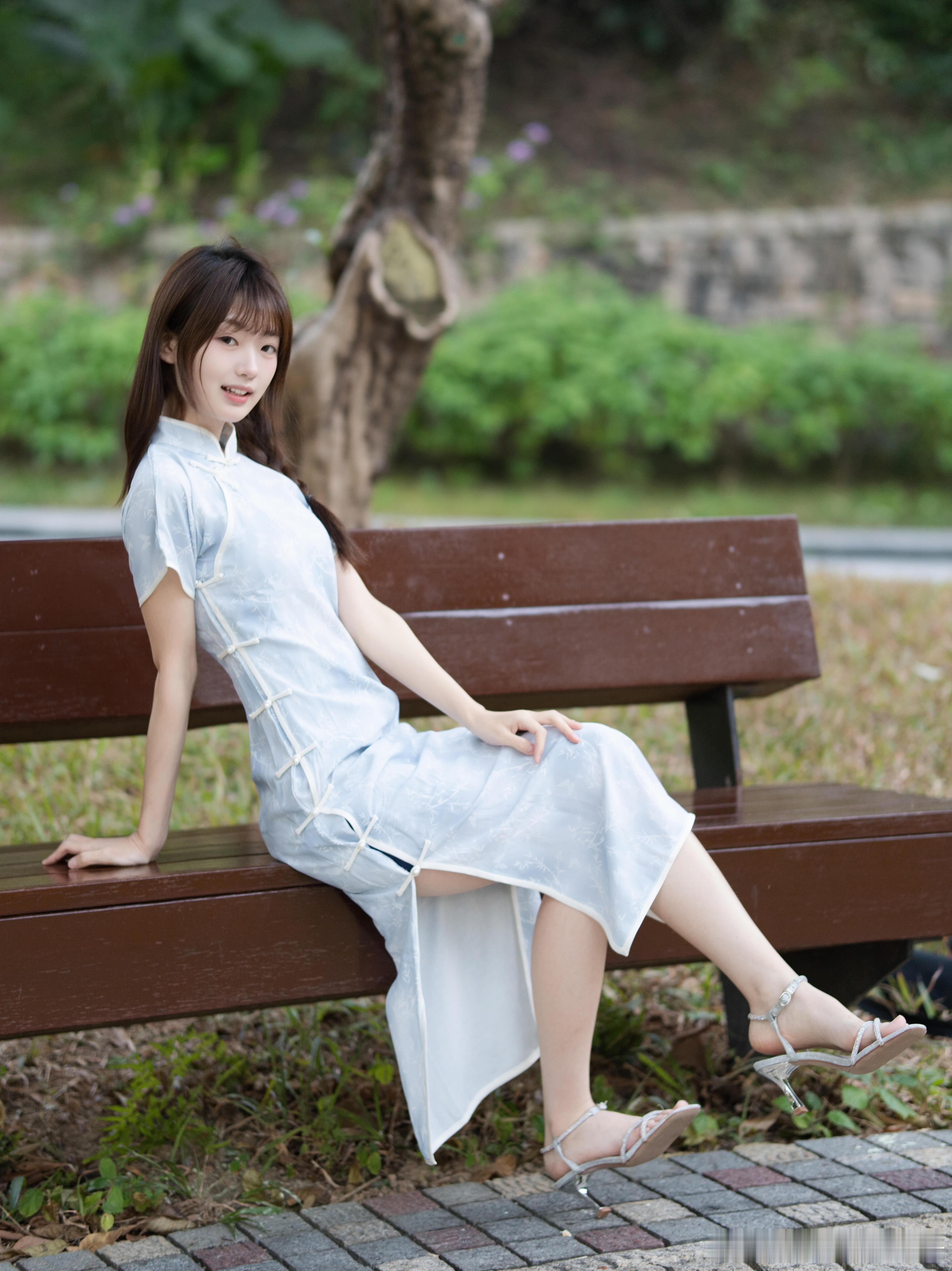把江南的泛蓝色温柔旗袍穿在身上
