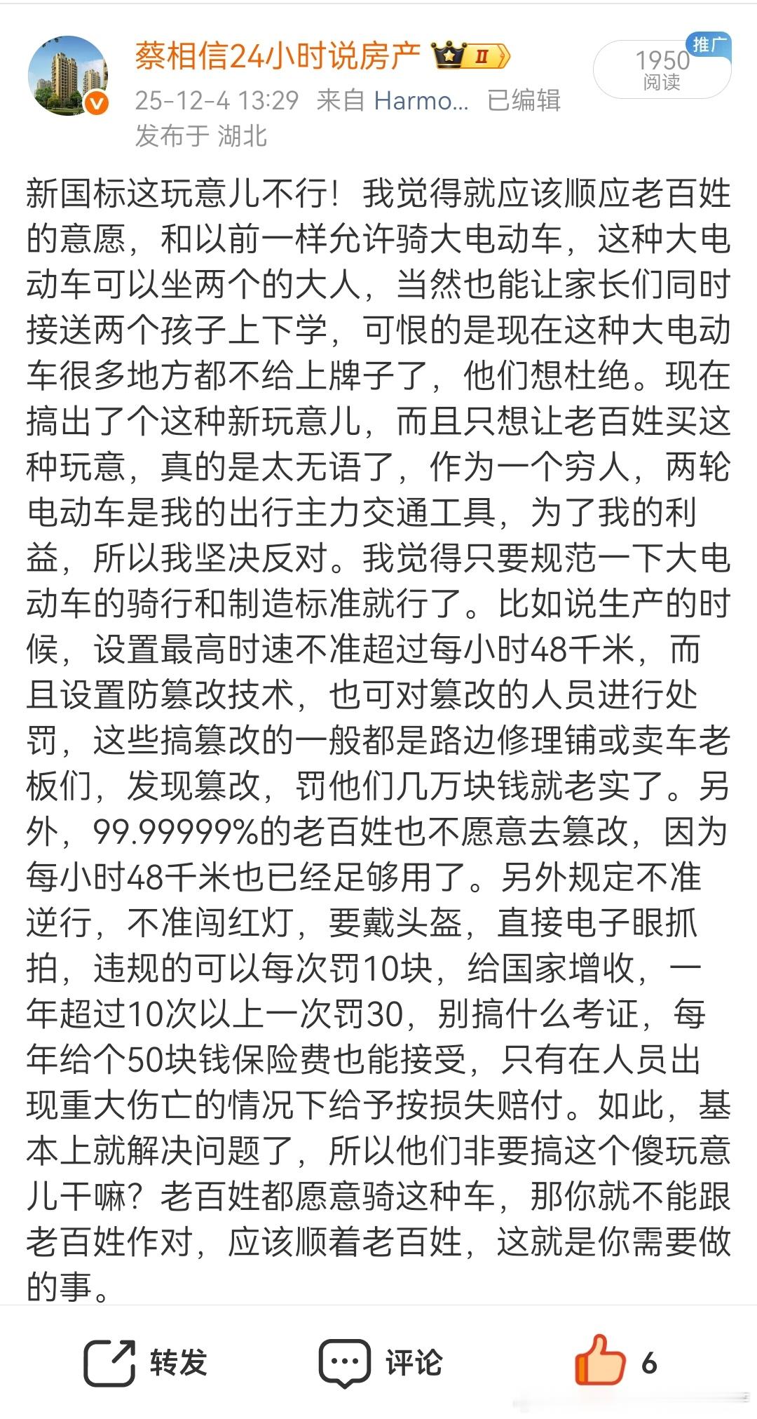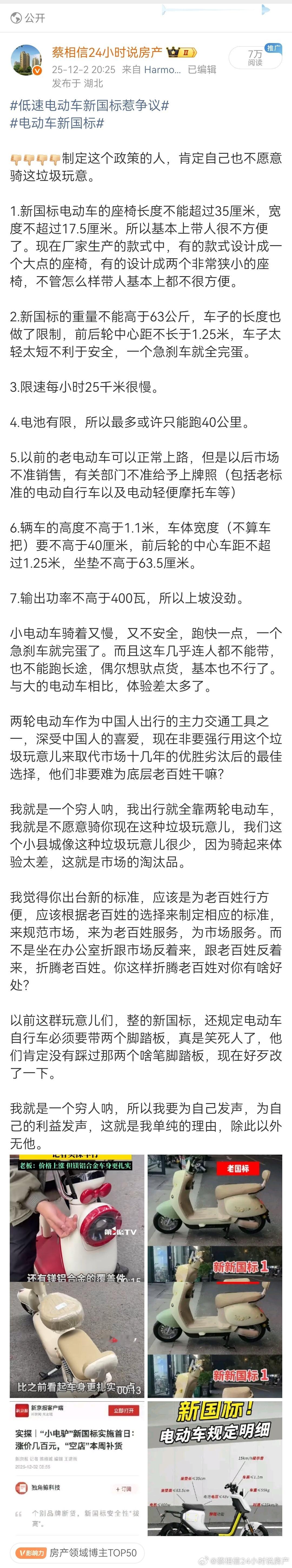 低速电动车新国标惹争议 两轮电动车是非常安全的交通工具 为什么说两轮电动车是非常安全的交通工具?我们接下来将用数据证明!2023年,我国两轮电动车的保有量大约是3.8亿辆左右,汽车的保有量大约是3.3亿辆。所以①.两轮电动车的保有量比汽车多,②.或许基本上每个家庭都拥有了汽车和两轮电动车。③.结合保有量数据和从社会观察的角度来看,或许可以肯定的是,大部分家庭,两轮电动车的使用频率和使用时长要远高于汽车。但2023年,汽车造成的死亡人数是4.2万人,摩托车造成的死亡数量是9034人,只占汽车造成的死亡人数的21.4%。摩托车造成的死亡人数里,还包括了那些喜欢飙烧油大马力摩托车的小青年,虽然他们的墓碑名写的是“对方全责”,但把他们算进摩托车的死亡人数里的确是对普通老百姓使用的那种常规电动摩托车的不公平。都说两轮电动车不安全,从数据上看,我看比汽车安全。 两轮电动车速度慢,目前市场上的电动摩托车时速一般最高也就是每小时50公里,再加上在市区速度更慢,一般也就是20公里到40公里,而且技术成熟,大部分款式车体略大,所以刹车稳当,加上非常灵巧,容易躲避,视野也非常开阔全面,所以造成的死亡人数并不多,从国家公布的数据上来看,事实也如此。