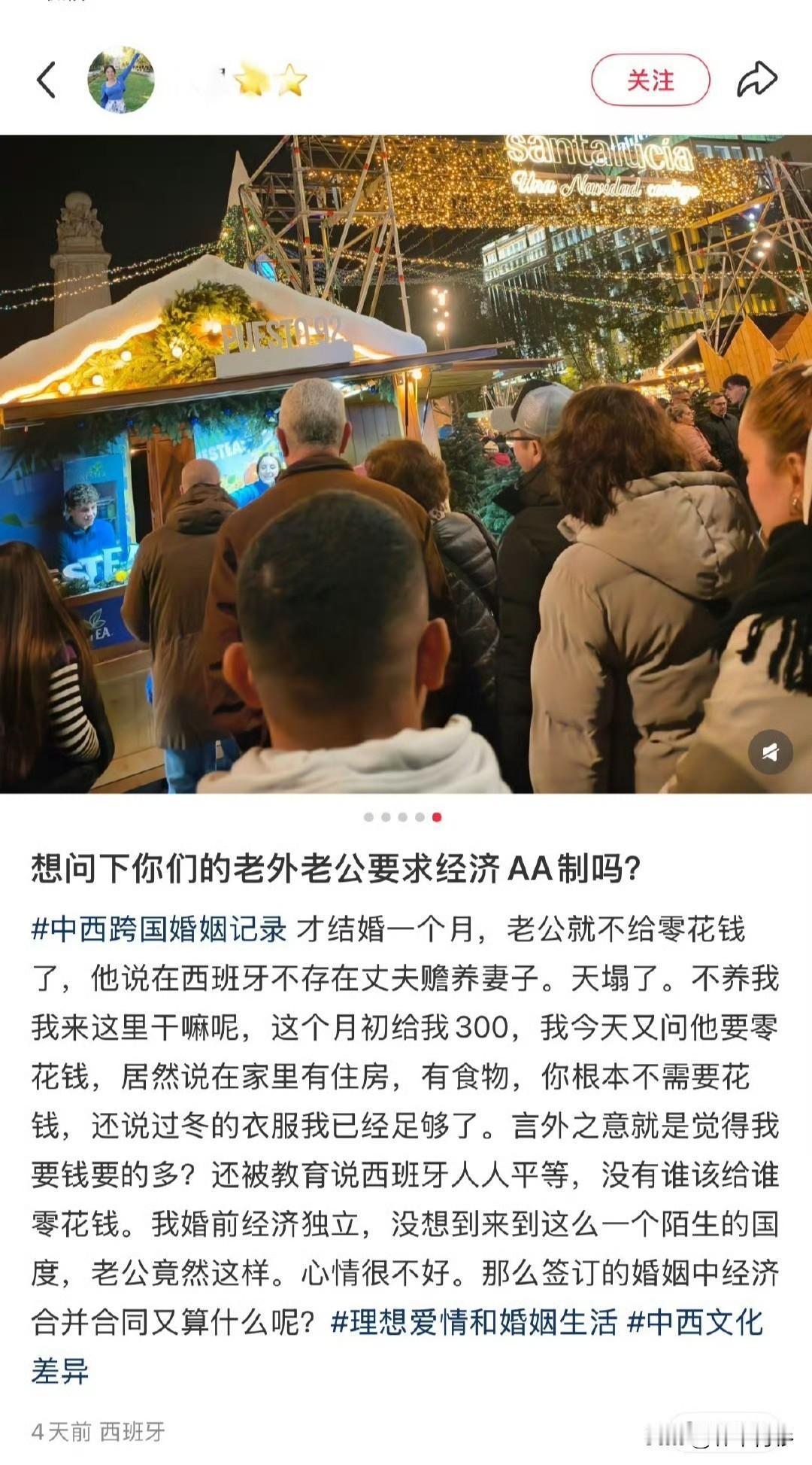 女子前一秒与西班牙老公秀恩爱,后一秒吐槽西班牙老公一分钱也不给! 消息来源:国内社交平台 最近关于这名女子与西班牙老公的帖子在网上很火,我想很火的原因就是因为女子前后的反差吧! 通过女子发布的内容可以得知:该名女子离婚后结识了这名西班牙男子,于是两人开启了一段原以为会十分浪漫的“跨国之恋”,当女子嫁到西班牙后,一开始满屏的都是炫耀,她本人每次也会晒出十分开心的合照! 原本以为这就是一个幸福的结局,谁知一个月过后,女子开始在网上一直吐槽她的西班牙老公。 她近期最火的一篇帖子就是讲述与他老公关于资金的问题,女子吐槽道:结婚一个月后西班牙老公一分钱也不给,原本在国内经济独立的她,没想到来到西班牙以后会过的如此糟糕! 值得注意的是,女子还说到了她与西班牙男子结婚时,还签署了一份经济合并的合同。 原来这份合同是为了把她的经济给“框”进去了! 个人观点:既然已经嫁到了国外,个人觉得就没必要跑国内社交平台来抱怨了,个人是尊重你的选择的,既然日子已经这样,那就好自为之吧!