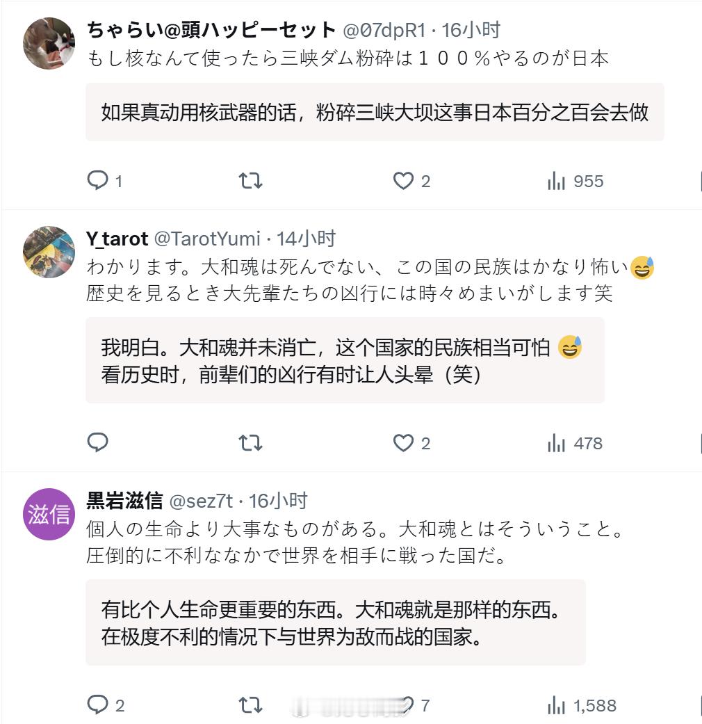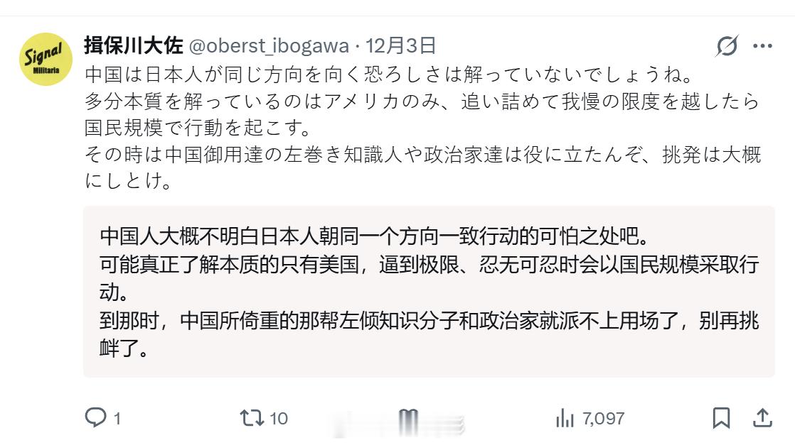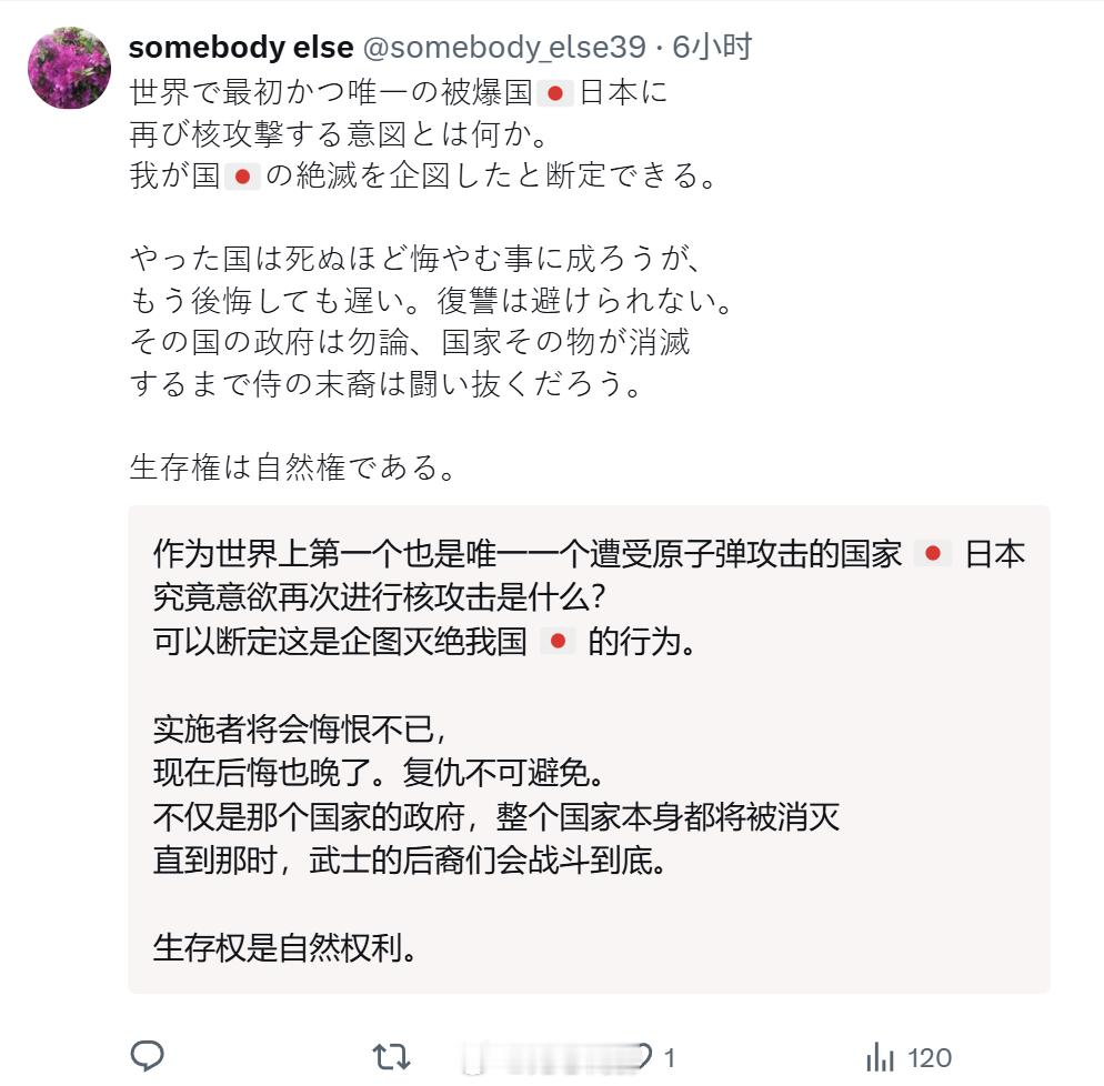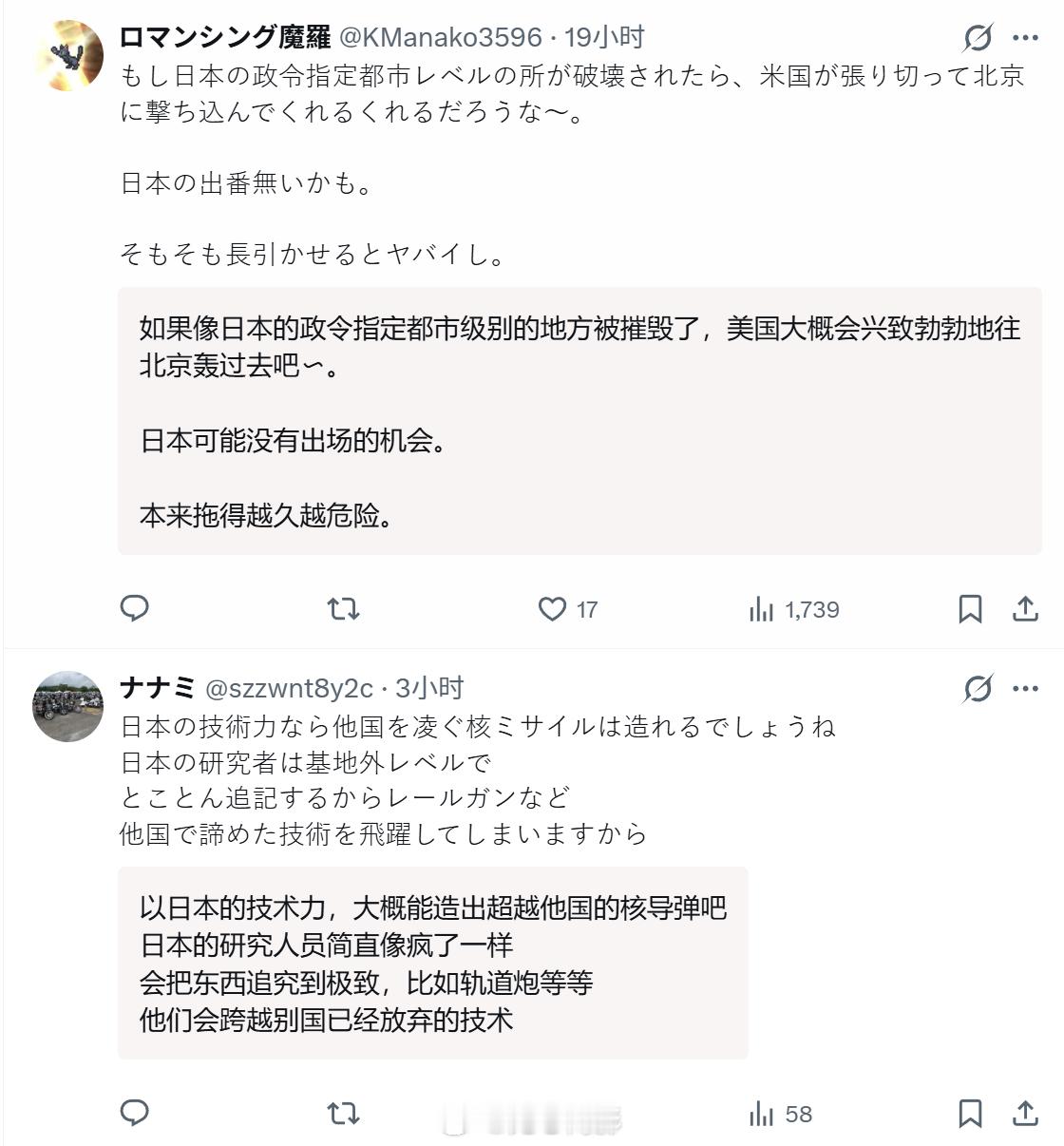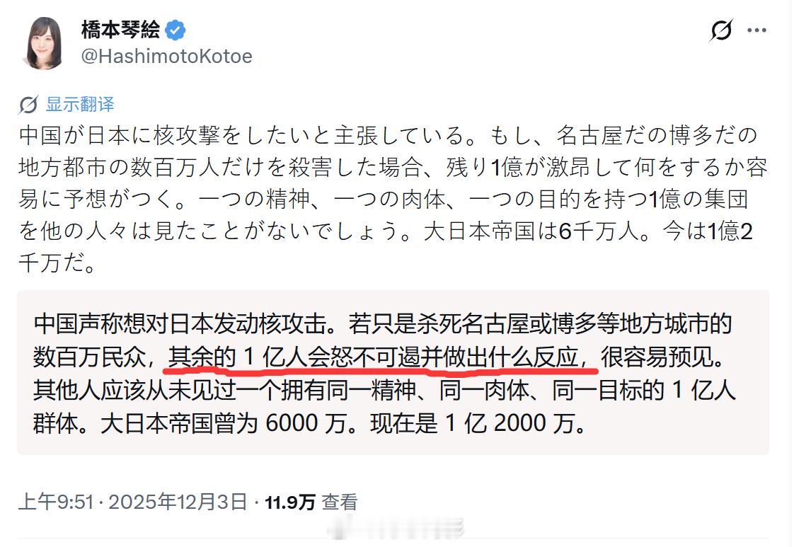 日本右翼网红桥本琴惠说“中国声称想对日本发动核攻击”。然后她又说:“若只是杀死名古屋或博多等地方城市的数百万民众,其余的 1 亿人会怒不可遏并做出什么反应?”投降呗,还能怎么反应,当年你们“真·大日本帝国”都投降了,剩下现在这么个阉割版的哈基倭还吹出“宇宙版大和魂”了?海外新鲜事
