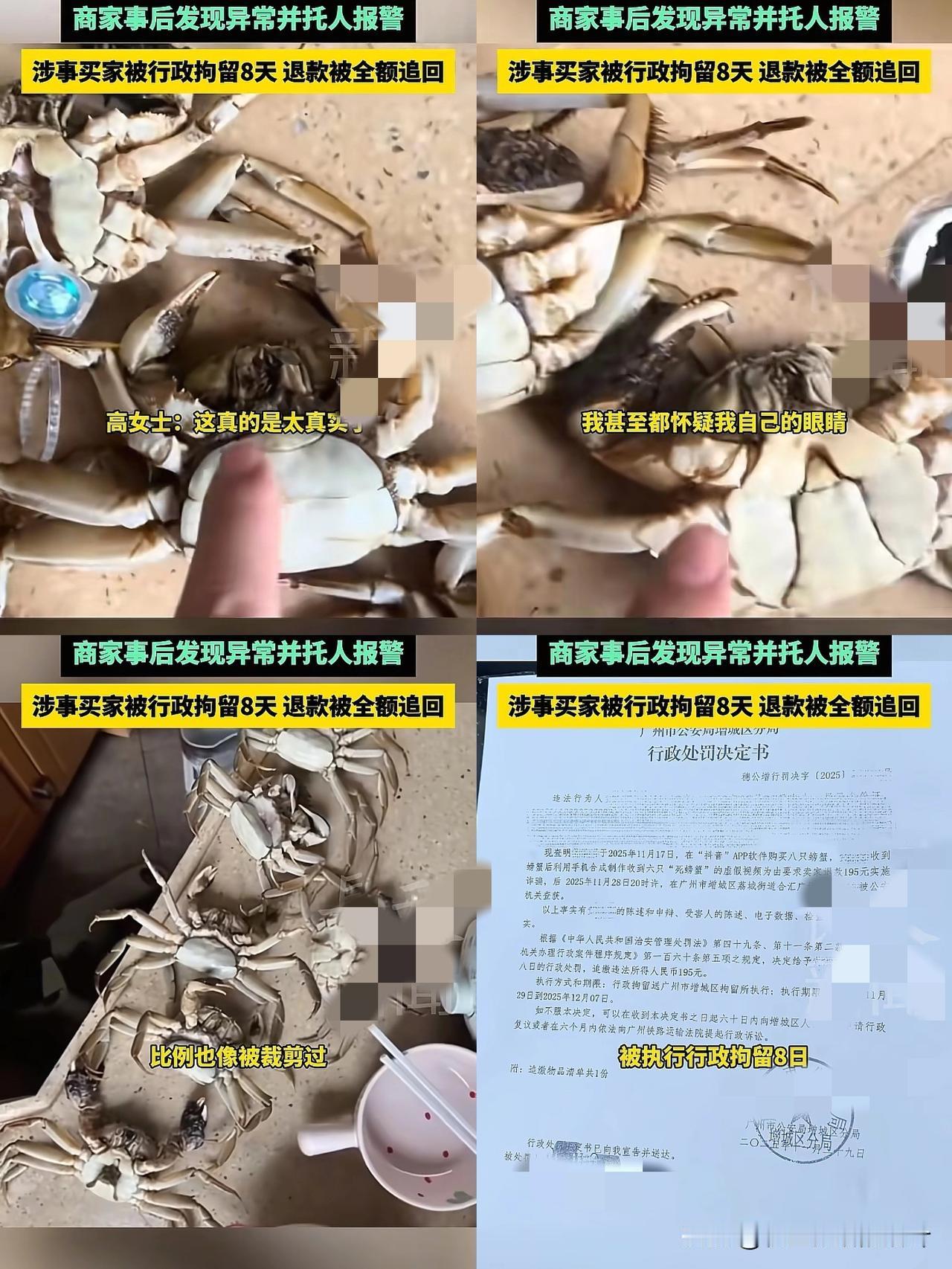 AI技术已经这么先进了? 都开始会骗人了 买家利用AI生成“死螃蟹”假视频,要求卖家退款。视频完全可以达到以假乱真的程度,一时间把竟把卖家蒙在鼓里。可“买家没有卖家精”,仅仅看了几遍视频便发现漏洞,不仅追回赔偿款,还让他进去待了8天! 买家网上花了195元买了8只大闸蟹,可货到后,却给卖家发了一条视频。视频中显示6只已经死亡,视频很真实,不仅有蟹扣,就连手指碰上大闸蟹,触感也很真实。 在赔偿195元后,卖家仔细钻研起这条视频。没多久就发现了端倪,不仅视频中的螃蟹和自己发的公母数量对不上,就连视频比例更是不一致,有很明显裁剪的痕迹。 后来才明白,原来是AI合成的。卖家得知真相后,依法处理,很快就有了进展。买家不仅归还了195元赔偿款,更是需要进去待8天。 商家从怀疑自己眼睛到发现公母数量破绽,这观察力绝了!结果真的大快人心,195元也值得这么大费周章?
