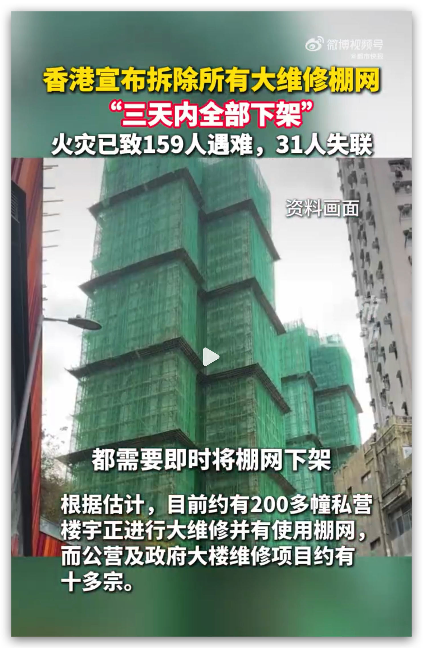 香港宣布拆除所有大维修的楼宇棚网 一次惨痛的大火教训倒逼香港竹棚拆除高层大火本来救援难度就高,还叠加易燃的棚网现在国内的超高层住宅也越来越少后期维护成本和难度太高了