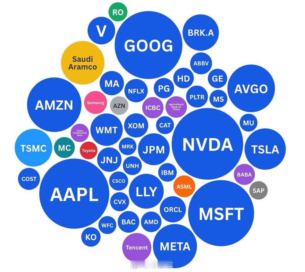 1989年和2025年全球市值排名前50的公司比较 ←左图:1989年 →右图:2025 🟥红色:日本公司 🟦蓝色:美国公司数据可视化
