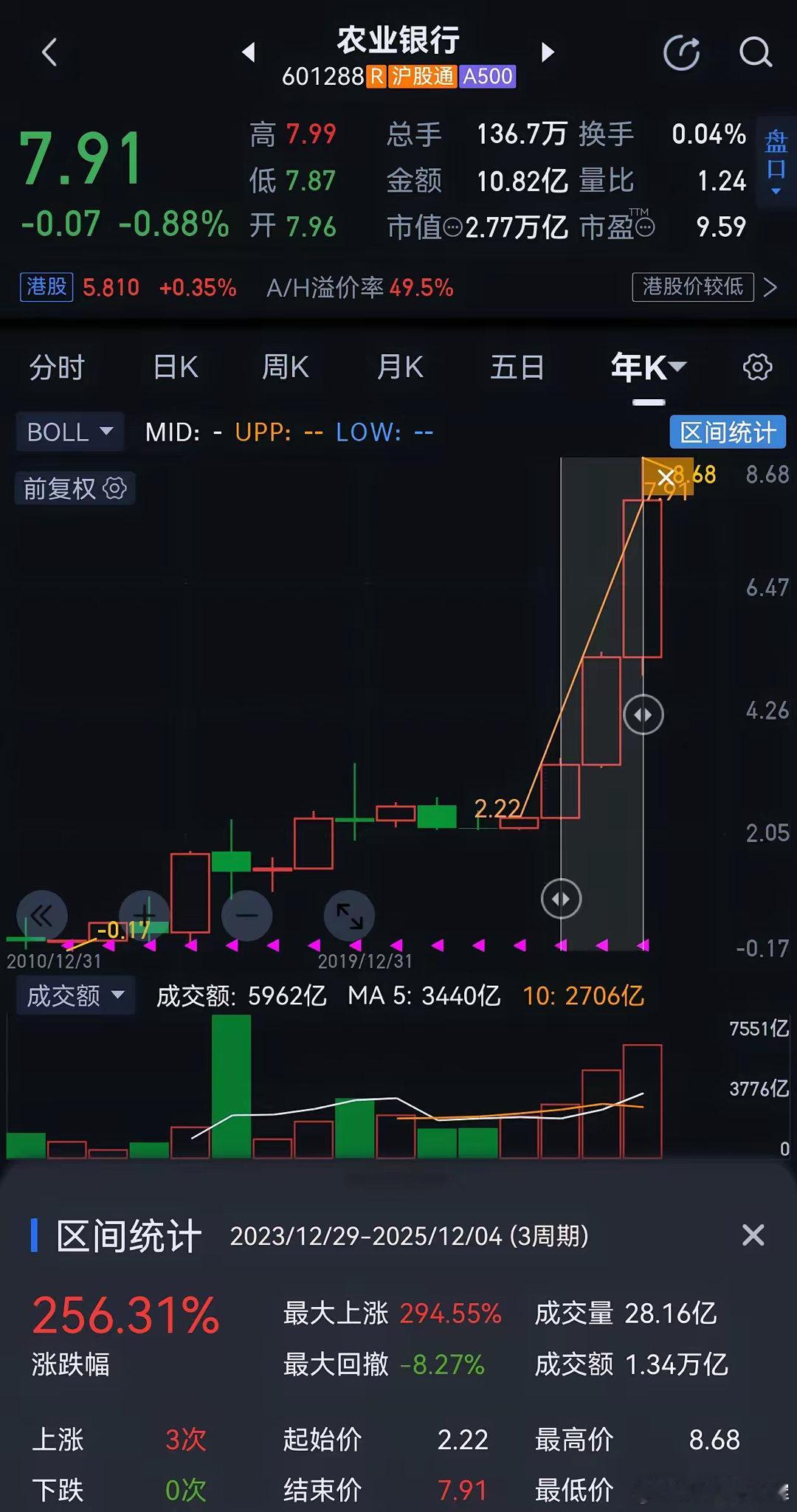 农业银行从2.22到8.68,3年涨了4倍,赚了3倍。财经大V哪个不是天天吐槽银行股,哪个不是天天吐槽国家队拉银行。你们连3年4倍的大盘股都没看懂,只知道忽悠散户买课听讲追涨杀跌,年底一算账,指数都4千了,竟然85%的股民都是亏损的。你该怪国家队还是怪自己太贪心、太愚蠢。我昨天偶悟了什么是金融,金融就是利用你的愚蠢花你的钱,利用你的贪婪赚你钱。金融的价值就是贪婪与恐惧创造价值。