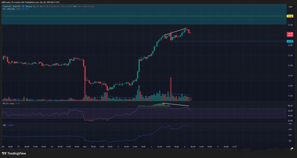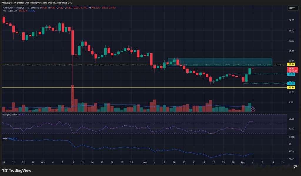 Chainlink (LINK ) 上周借助ETF消息和现货买家推升,短短几天涨15%,最高触13.57美元。周一跟随大盘下挫至11.74美元,但迅速反弹至14.61美元,涨幅近24%。短期动能偏看涨,但整体趋势仍弱,14.2-15.4美元可能区间震荡,突破16.6美元还需更多买盘支撑。交易者保持耐心,注意仓位调整。区块链BTC山寨币