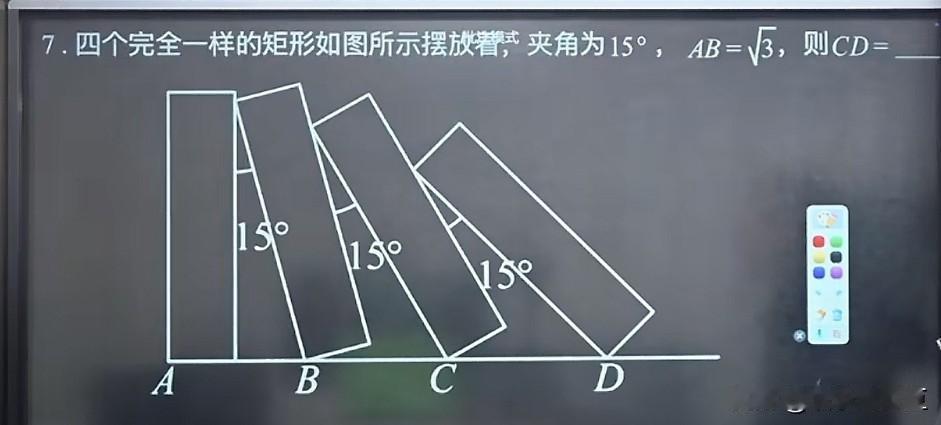 看到一道几何“刁钻题”,4个矩形歪着摆,这题出得灵活!打破常规出题方向。 四个平平无奇的矩形,歪着摆、夹个15°角,就能难倒一片人?这题的“刁钻”程度直接拉满。 明明是矩形,但偏不规规矩矩排,相邻两个非要扭出15°夹角;给的条件就一个AB=√3,连矩形的长和宽都藏得严严实实;更狠的是,要算的CD还得绕着这几个“歪矩形”的边、角一点点扒关系,三角函数、矩形对边相等的性质一个都落不下,甚至15°这种“冷门角”的三角函数值都得精准用上! 它的“灵活”更绝:看着是矩形问题,实则是几何性质+三角函数的综合套娃,既要能从歪扭的图形里抓出矩形的边长联系,又得敢对着15°角算正弦余弦,少一步转化都摸不着头脑! 欢迎算出CD的大神速来评论区秀操作。