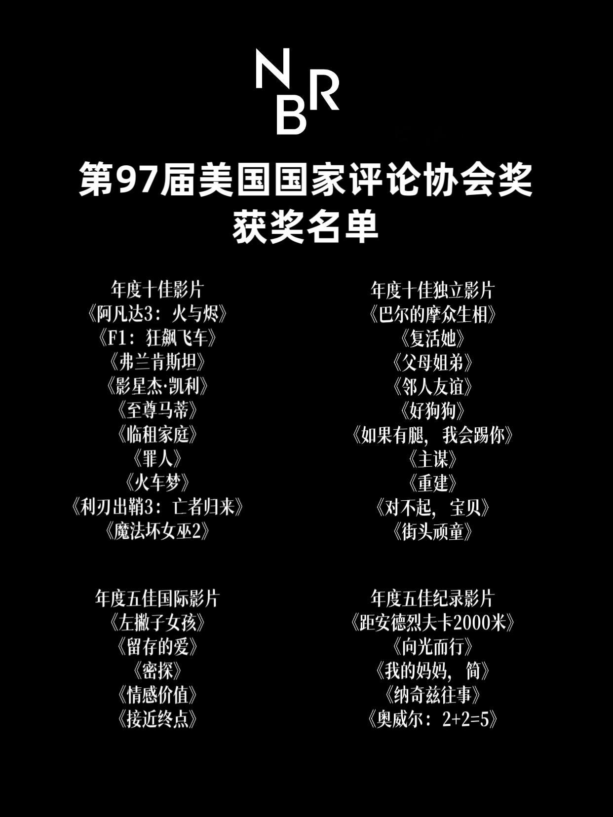 北美颁奖季四大前哨之一,第97届美国国家影评人协会奖公布获奖名单,影片《一战再战》获得包括最佳影片在内的5项大奖成为最大赢家,“小李子”莱奥纳多·迪卡普里奥与柏林主角奖得主萝丝·拜恩分别获得此站影帝影后,金棕榈影片《普通事故》再获最佳国际影片奖。以下为获奖名单↓ ↓ ↓第97届美国国家评论学会奖获奖名单最佳影片:《一战再战》最佳导演:保罗·托马斯·安德森《一战再战》最佳男主角:莱昂纳多·迪卡普里奥《一战再战》最佳女主角:萝丝·拜恩《如果有腿,我会踢你》最佳男配角:本尼西奥·德尔·托罗《一战再战》最佳女配角:英加·伊布斯多特·莉莉亚斯《情感价值》最佳导演首作:伊娃·维克托《对不起,宝贝》最具突破演员:蔡斯·英菲尼迪《一战再战》最佳原创剧本:《罪人》最佳改编剧本:《火车梦》最佳摄影:《罪人》最佳特技表演:《碟中谍8:最终清算》最佳国际影片:《普通事故》最佳动画影片:《彩虹》最佳纪录影片:《黑幕:调查记者的真相之路》自由表达奖:《把灵魂放在掌上前行》年度十佳影片《阿凡达3:火与烬》《F1:狂飙飞车》《弗兰肯斯坦》《影星杰·凯利》《至尊马蒂》《临租家庭》《罪人》《火车梦》《利刃出鞘3:亡者归来》《魔法坏女巫2》年度五佳国际影片《左撇子女孩》《留存的爱》《密探》《情感价值》《接近终点》年度五佳纪录影片《距安德烈夫卡2000米》《向光而行》《我的妈妈,简》《纳奇兹往事》《奥威尔:2+2=5》年度十佳独立影片《巴尔的摩众生相》《复活她》《父母姐弟》《邻人友谊》《好狗狗》《如果有腿,我会踢你》《主谋》《重建》《对不起,宝贝》《街头顽童》