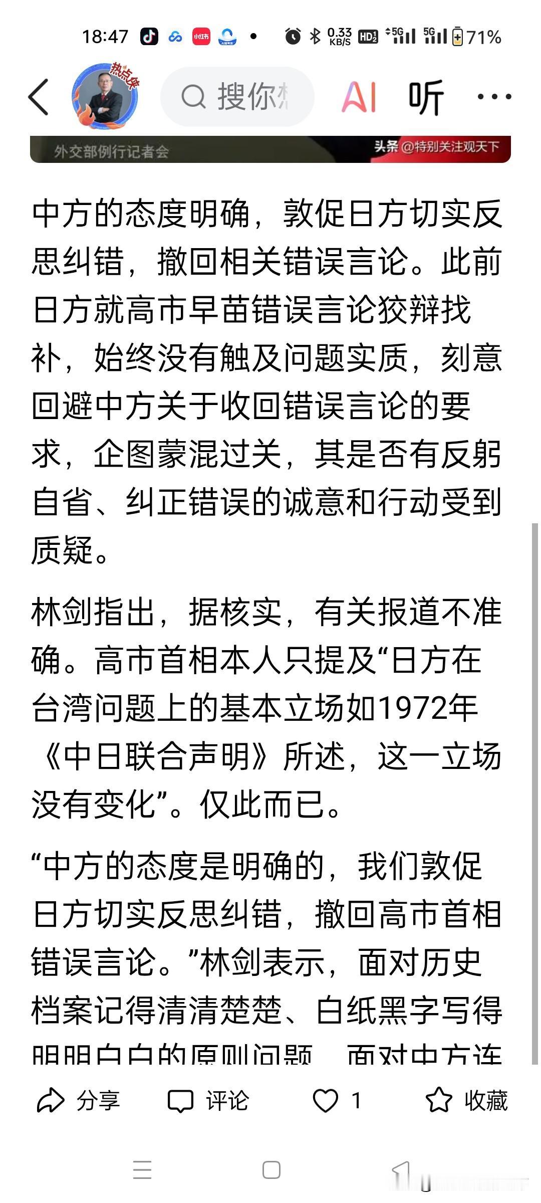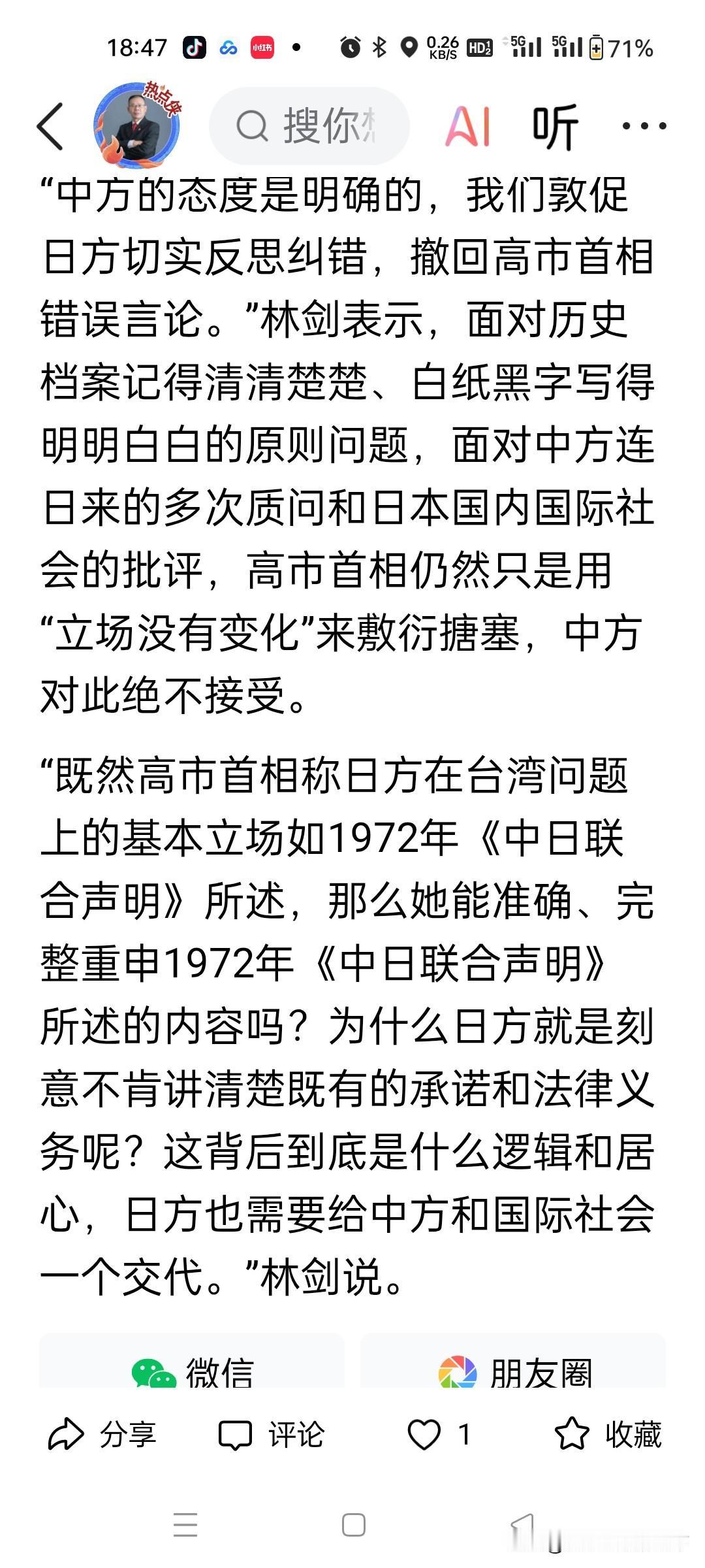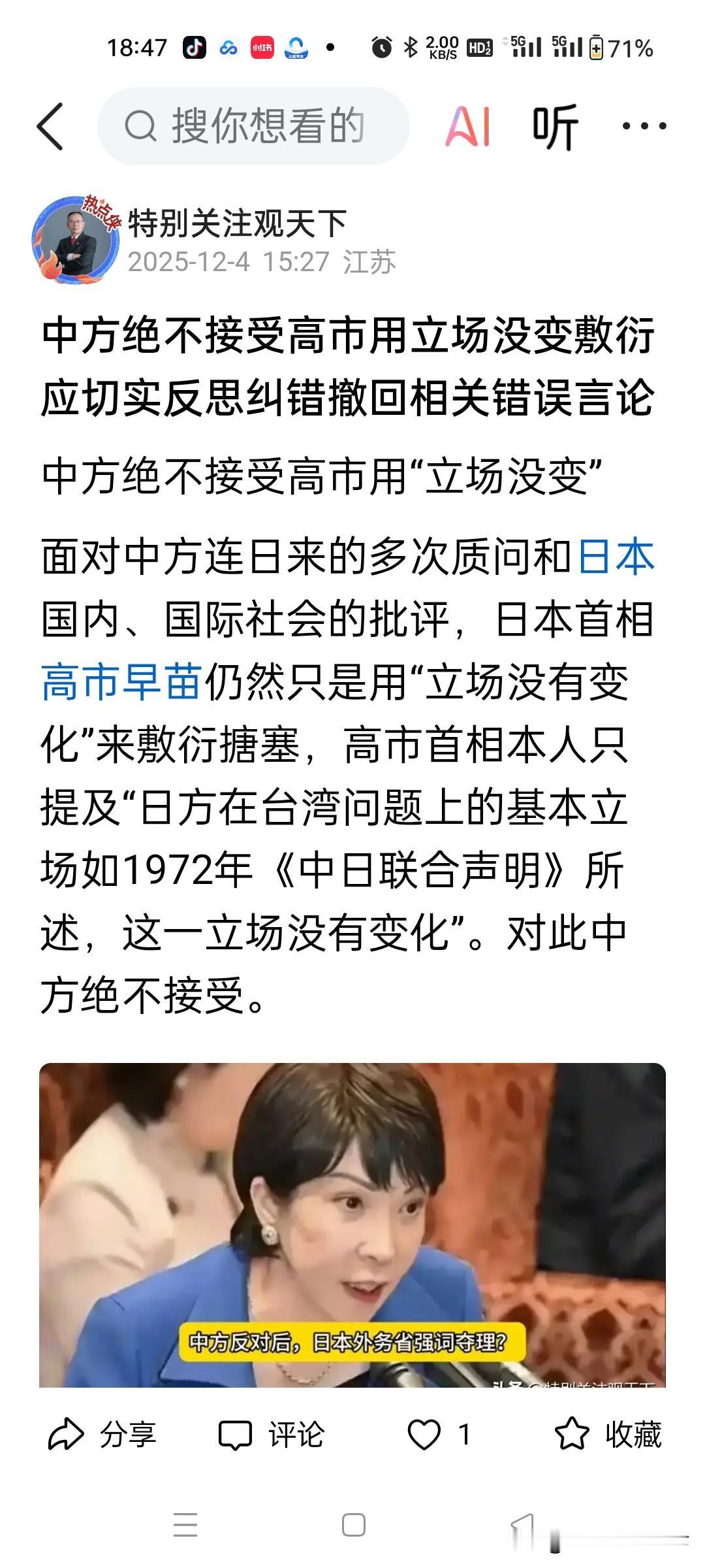 发了个高市早苗头条,又被头条扣了5分。 中方绝不接受高市用立场没变敷衍应切实反思纠错撤回相关错误言论 中方绝不接受高市用“立场没变” 面对中方连日来的多次质问和日本国内、国际社会的批评,日本首相高市早苗仍然只是用“立场没有变化”来敷衍搪塞,高市首相本人只提及“日方在台湾问题上的基本立场如1972年《中日联合声明》所述,这一立场没有变化”。对此中方绝不接受。