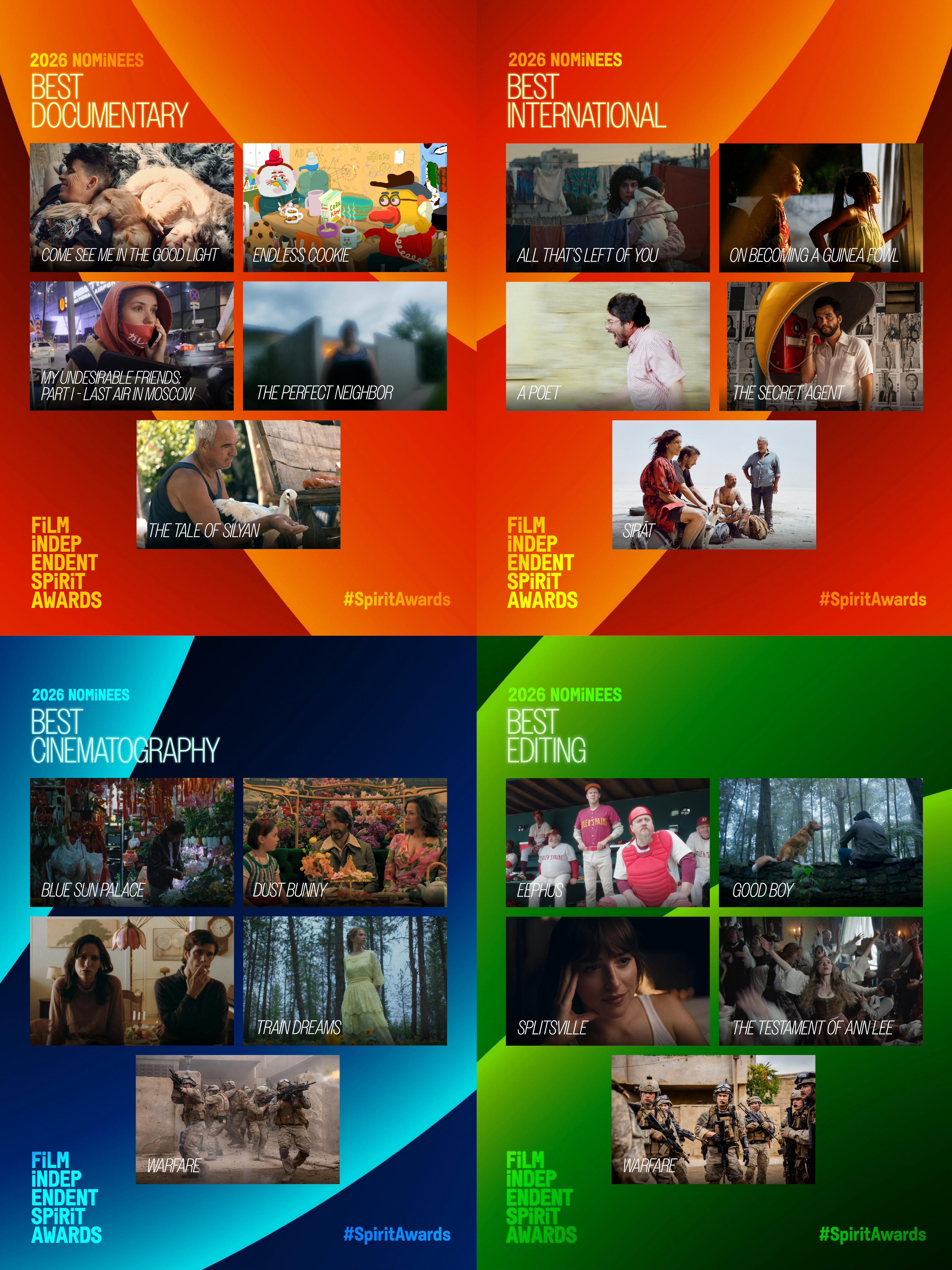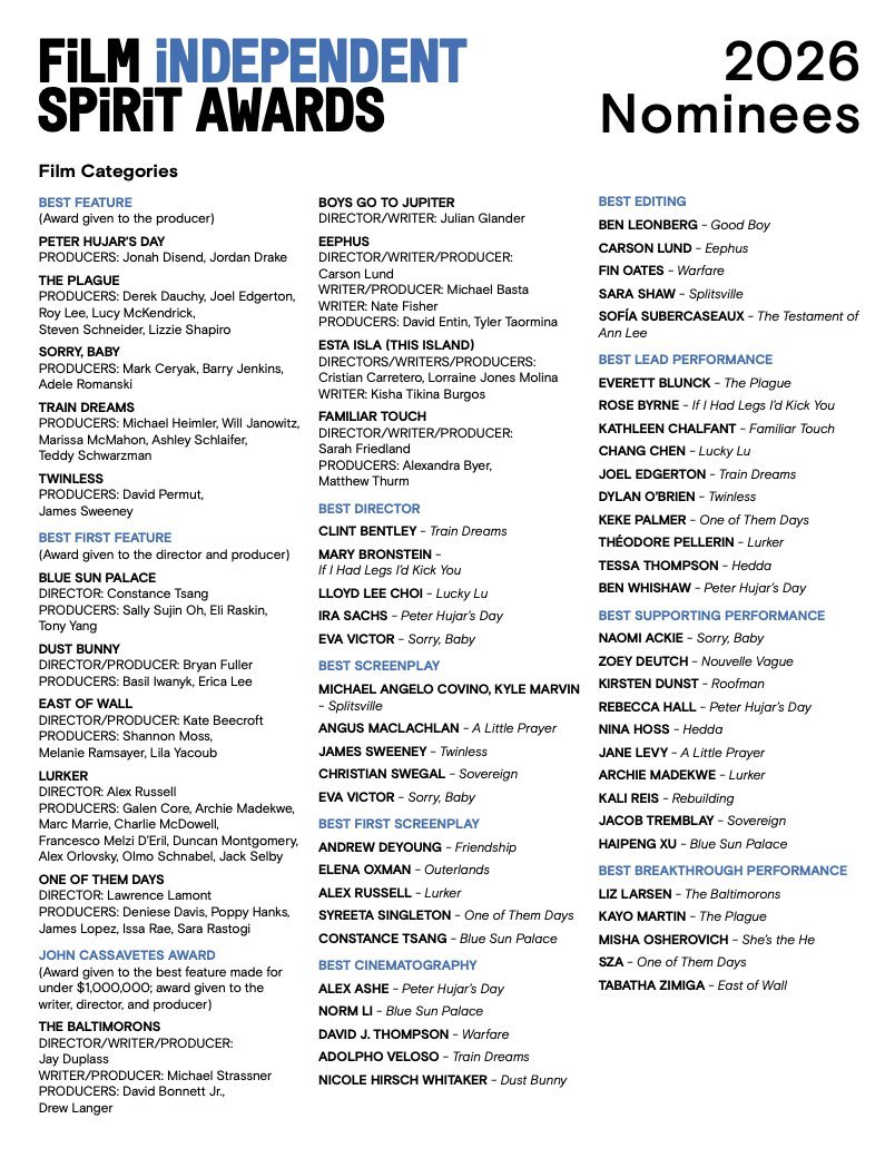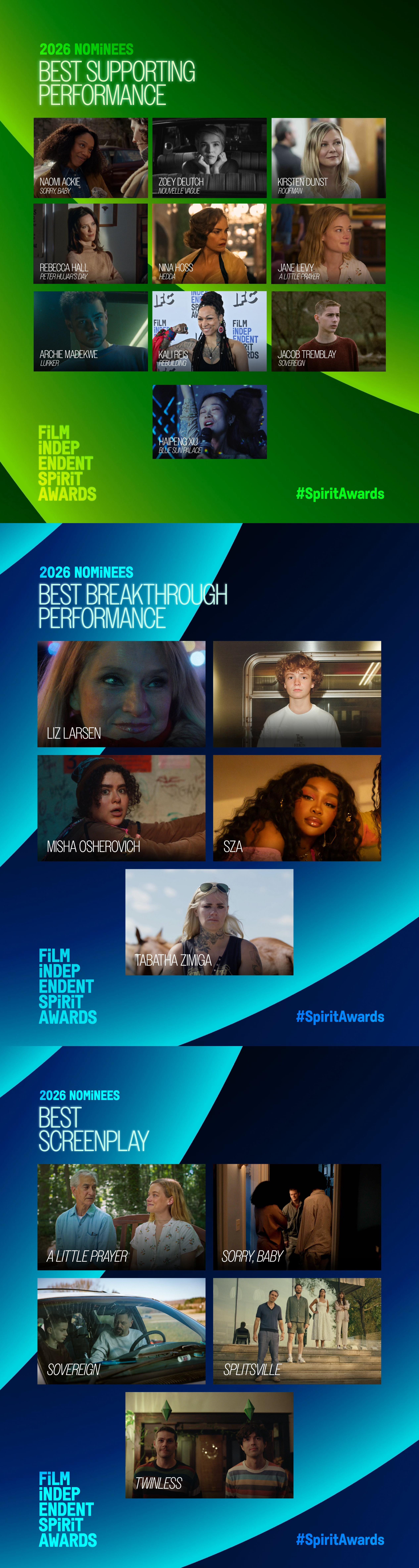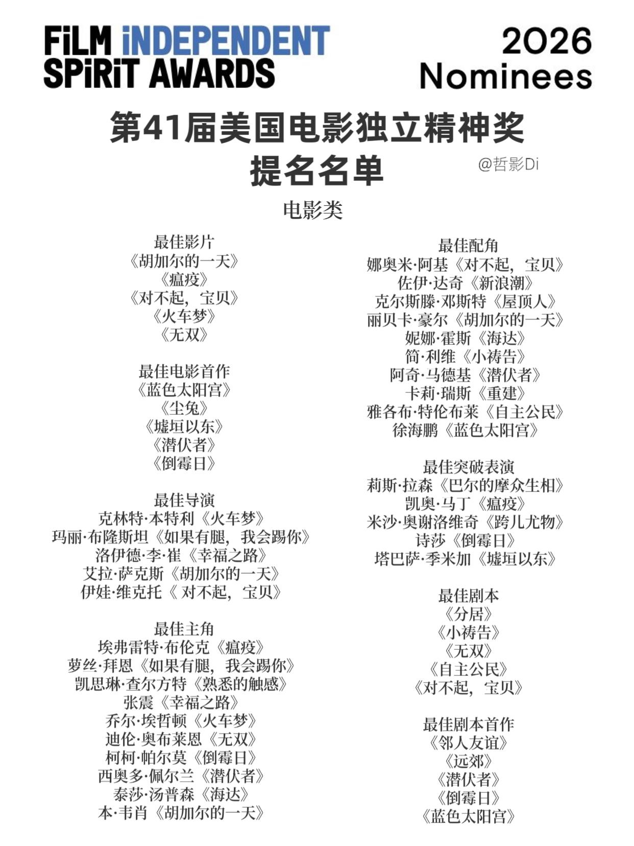 2025独立精神奖提名第41届美国电影独立精神奖提名公布,影片《胡加尔的一天》以5项提名领跑,《火车梦》《蓝色太阳宫》均获4项提名紧随其后,张震凭借《幸运之路》获得最佳主角提名,徐海鹏则以《蓝色太阳宫》的表演提名最佳配角,他们将与萝丝·拜恩、本·卫肖、克尔斯滕·邓斯特等争夺各自奖项。本届颁奖典礼将于2月15日举办。