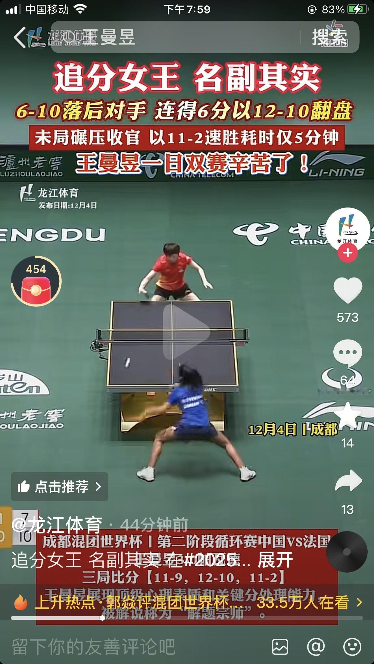 侯老师不卖货,专业解说敢夸曼昱:没办法,此题无解,王曼昱放风筝,王曼昱18般兵器,俄罗斯套娃,曼昱是最大那个,陪你玩会,不跟你玩了……[捂脸][捂脸][捂脸] 曼昱一日两赛算是3-0。晚上第二局6-10然后连得6分12-10。第三局11-2拿下。 明天应该让曼昱休息一下,伤病没有痊愈,这几场比赛没有恢复到最佳状态,好多大角度球没那么多的救了!一定要健康完赛,后面还有很多比赛,这个周期健康第一位