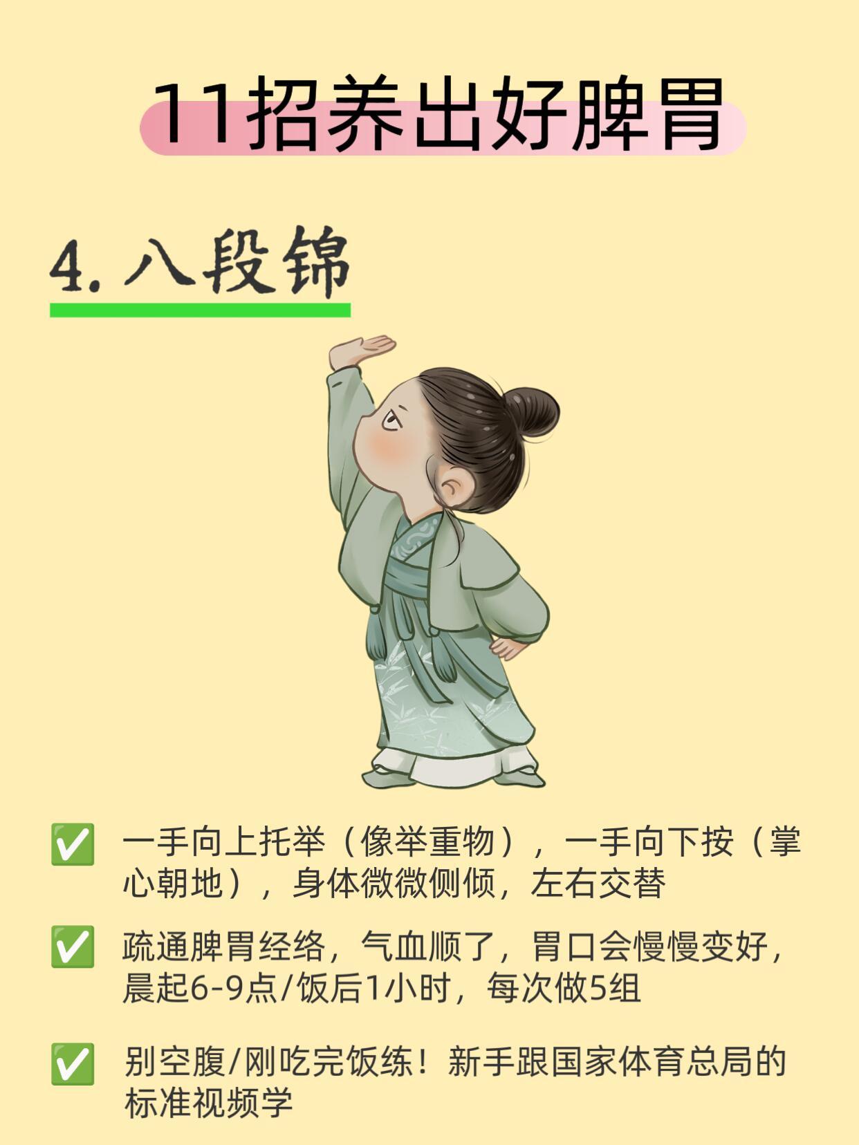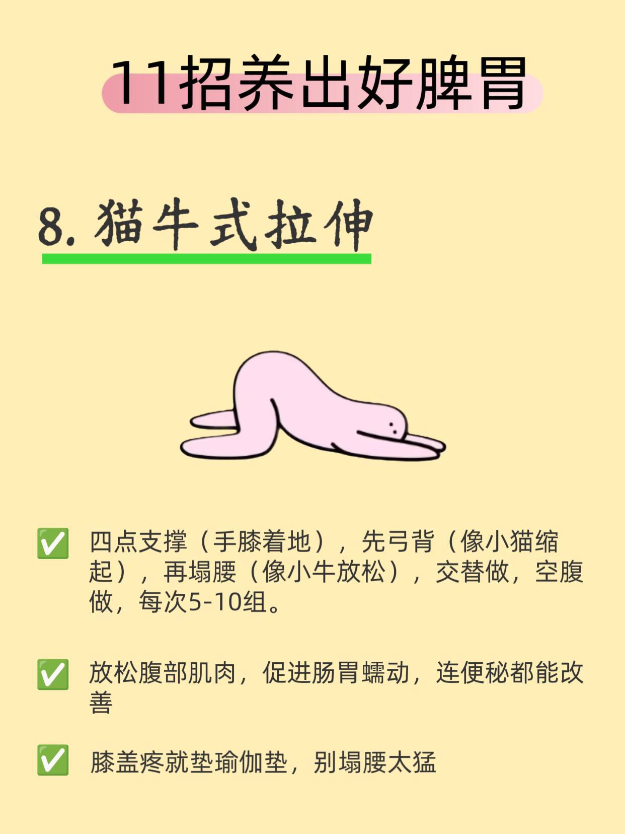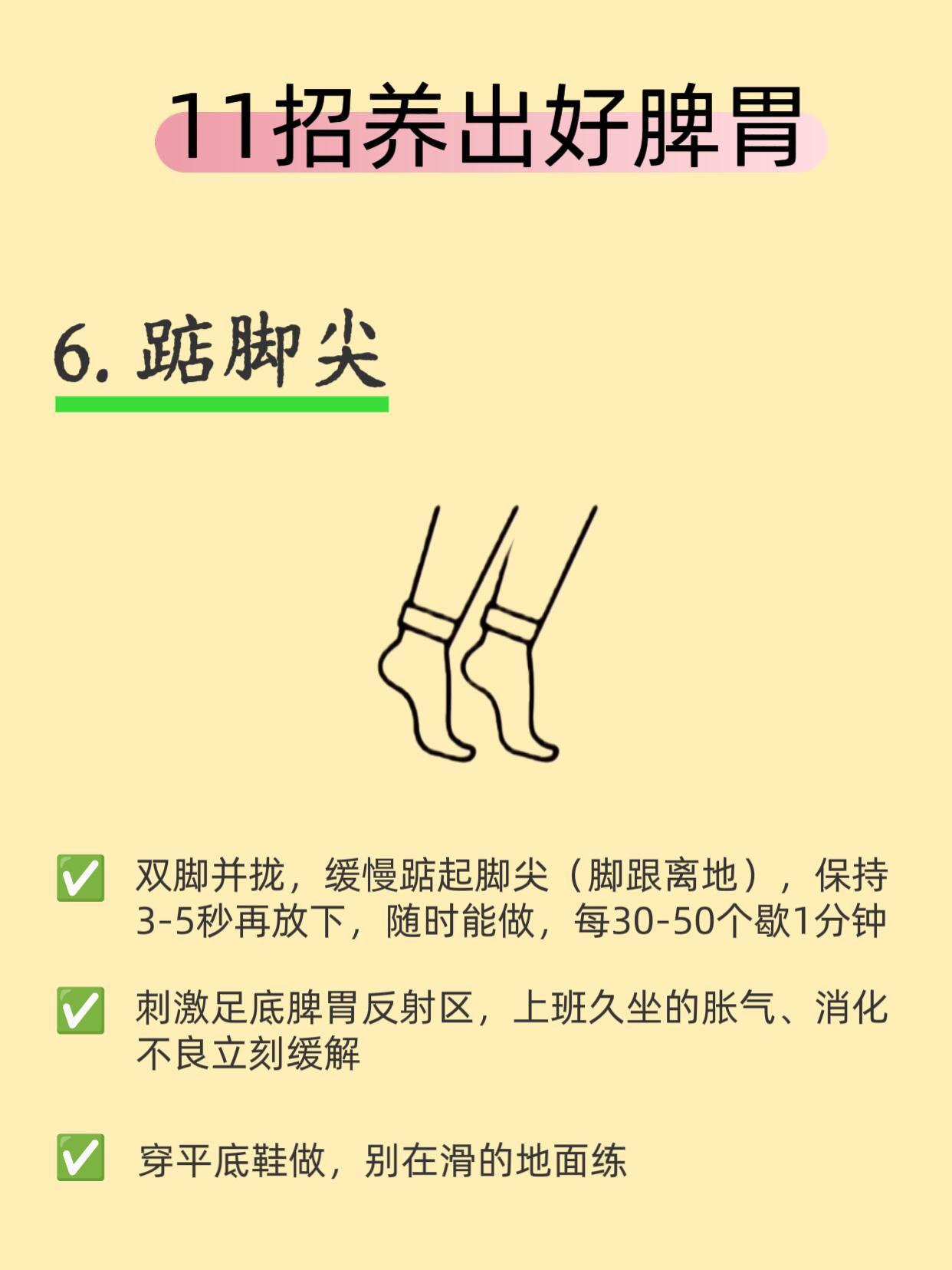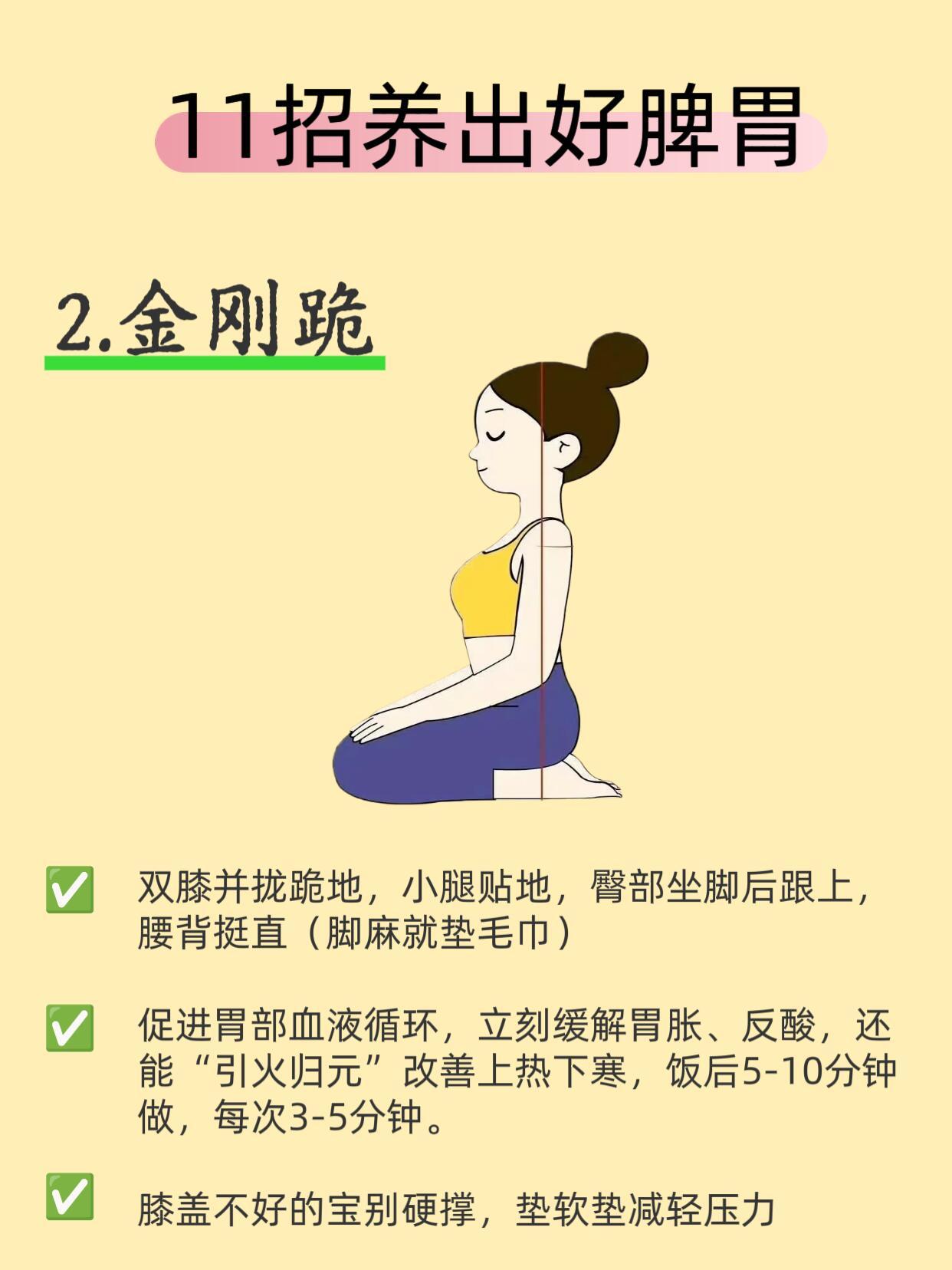 脾胃差最喜欢的运动,11招养好脾胃有没有姐妹跟我一样?吃点生冷、油腻就胀气,明明没吃多少却撑得慌,脸色还暗沉沉的~ 后来发现脾胃不用“猛养”,就靠日常这些温和小动作,成人、长辈都能做,碎片时间就能安排,坚持下来消化顺多了!🌟 11个家常养脾动作(简单好坚持)1⃣️. 饭后溜达:饭后30分钟慢走,不超7500步,温和促消化,别快走、别吹冷风;2⃣️. 金刚跪:双膝跪地坐脚后跟上,腰背挺直,饭后5-10分钟做3-5分钟,缓解胃胀反酸,膝盖不好垫软垫;3⃣️.揉腹:平躺屈膝,搓热双手顺时针轻揉肚脐5-10分钟,睡前/晨起空腹做,缓解腹胀便秘,刚吃饱别碰;4⃣️. 八段锦:一手托举一手下按,左右交替,饭后1小时做5组,疏通脾胃经络,新手跟标准视频学;5⃣️. 还阳卧:平躺脚心相对,双手放肚子,睡前15分钟做,缓解手脚冰凉,腿分不开别硬掰;6⃣️. 踮脚尖:缓慢踮起保持3-5秒放下,每天10分钟,每30-50个歇1分钟,改善久坐胀气;7⃣️. 贴墙站:后脑勺、肩臀脚跟贴墙,收小腹,饭后做5-10分钟,减轻脾胃负担;8⃣️. 猫牛式:四点支撑弓背塌腰交替,空腹做5-10组,促进肠胃蠕动,膝盖疼垫瑜伽垫;9⃣️. 金鸡独立:单脚站立抬另腿屈膝,早晚各1分钟,刺激足部经络,站不稳扶墙;🔟. 腹式呼吸:坐/躺时吸气鼓腹、呼气收腹,每次5分钟,增强脾胃运化,别用胸呼吸;1⃣️1⃣️. 养脾泡脚:40-43℃温水泡15-20分钟,晚7-9点/餐后1小时做,可加生姜片/艾叶,空腹、刚吃饱别泡。✨ 小提醒所有动作都以“舒服不勉强”为原则,不用贪多,选2-3个贴合日常的坚持就好~ 脾胃调理就像煲汤,得慢慢熬,把这些小动作融入生活,不用专门挤时间,慢慢就会发现:胃口开了,肚子不胀了,脸色也透着健康光泽!脾胃养脾胃健康养生