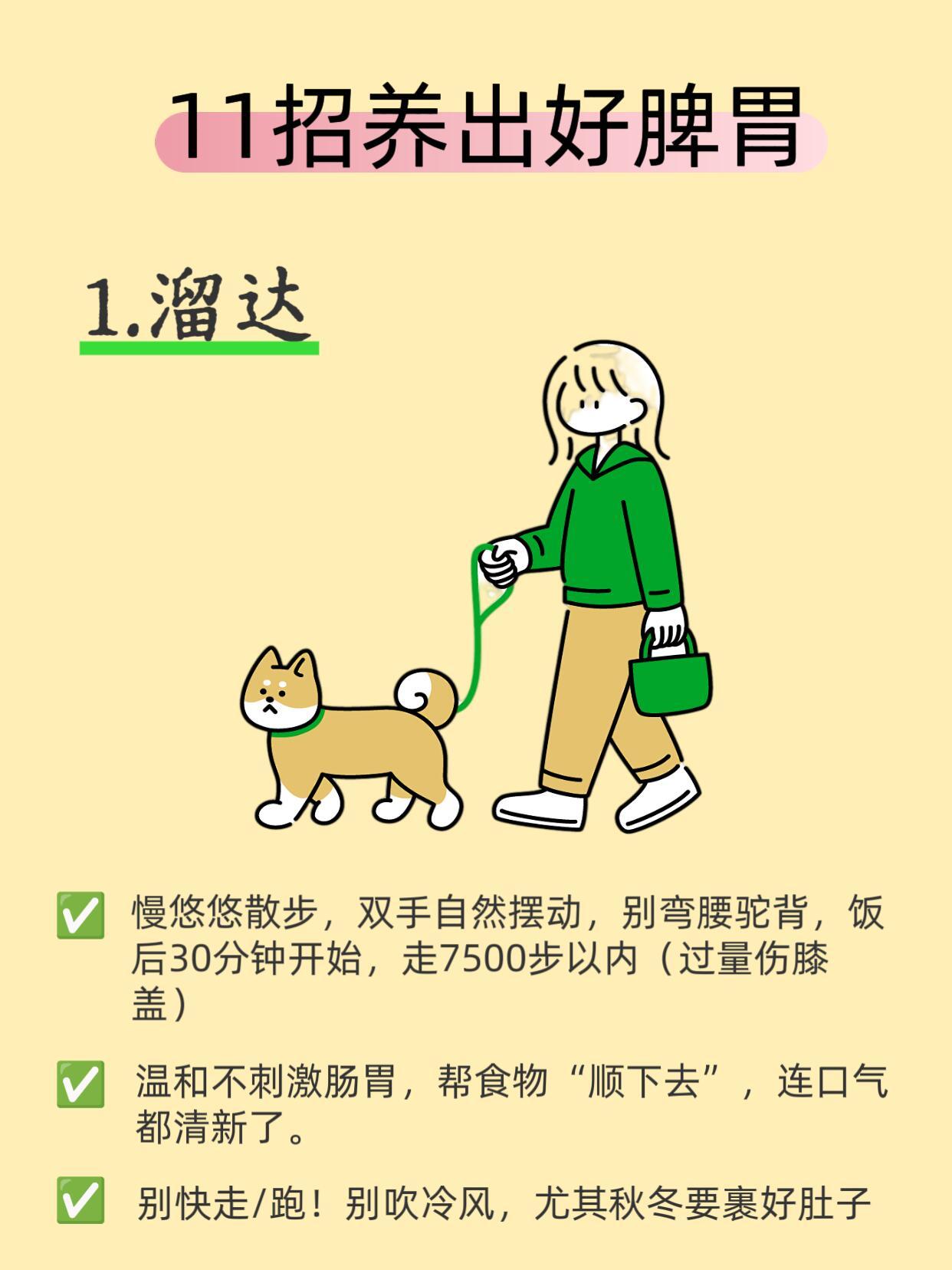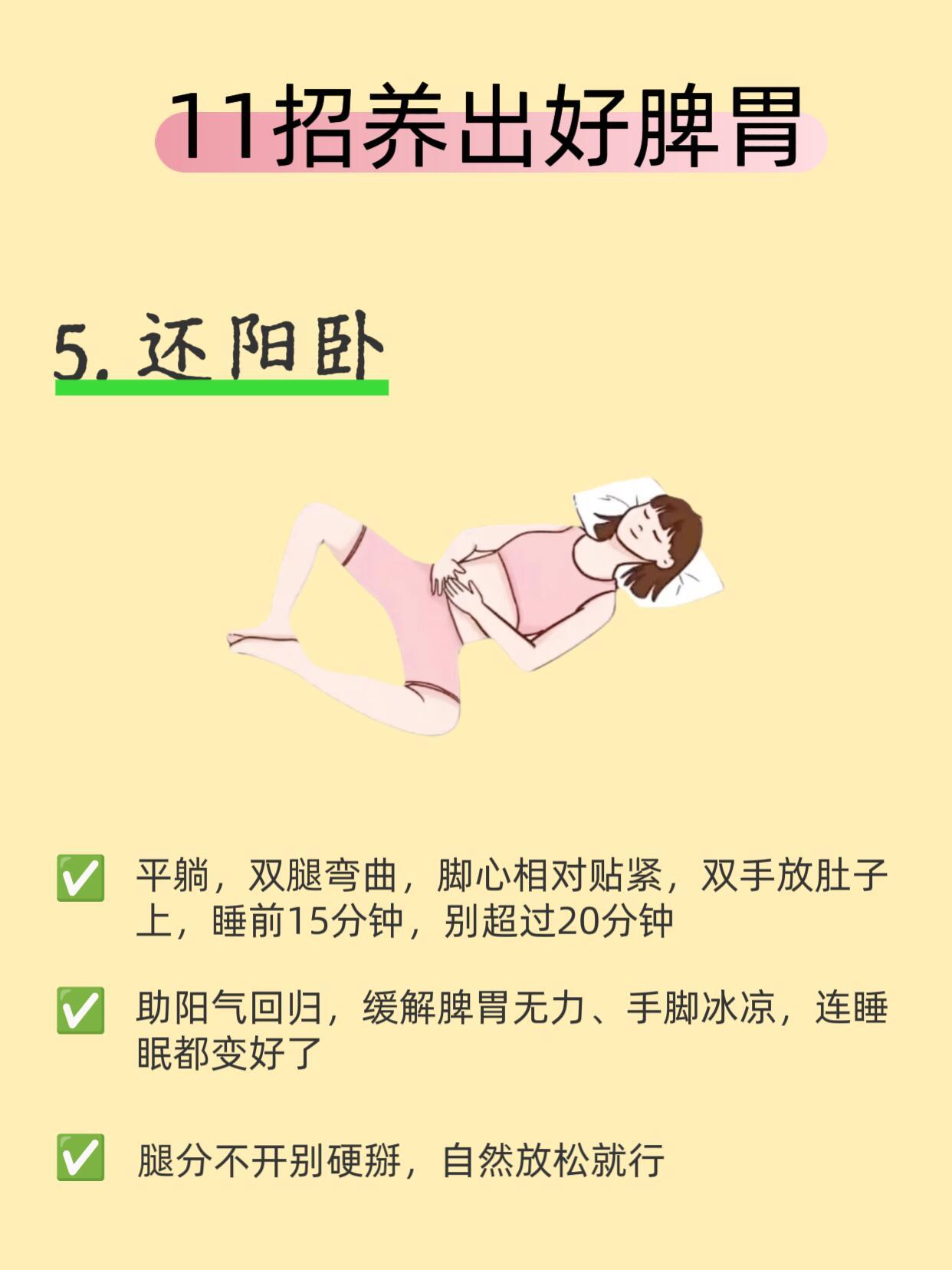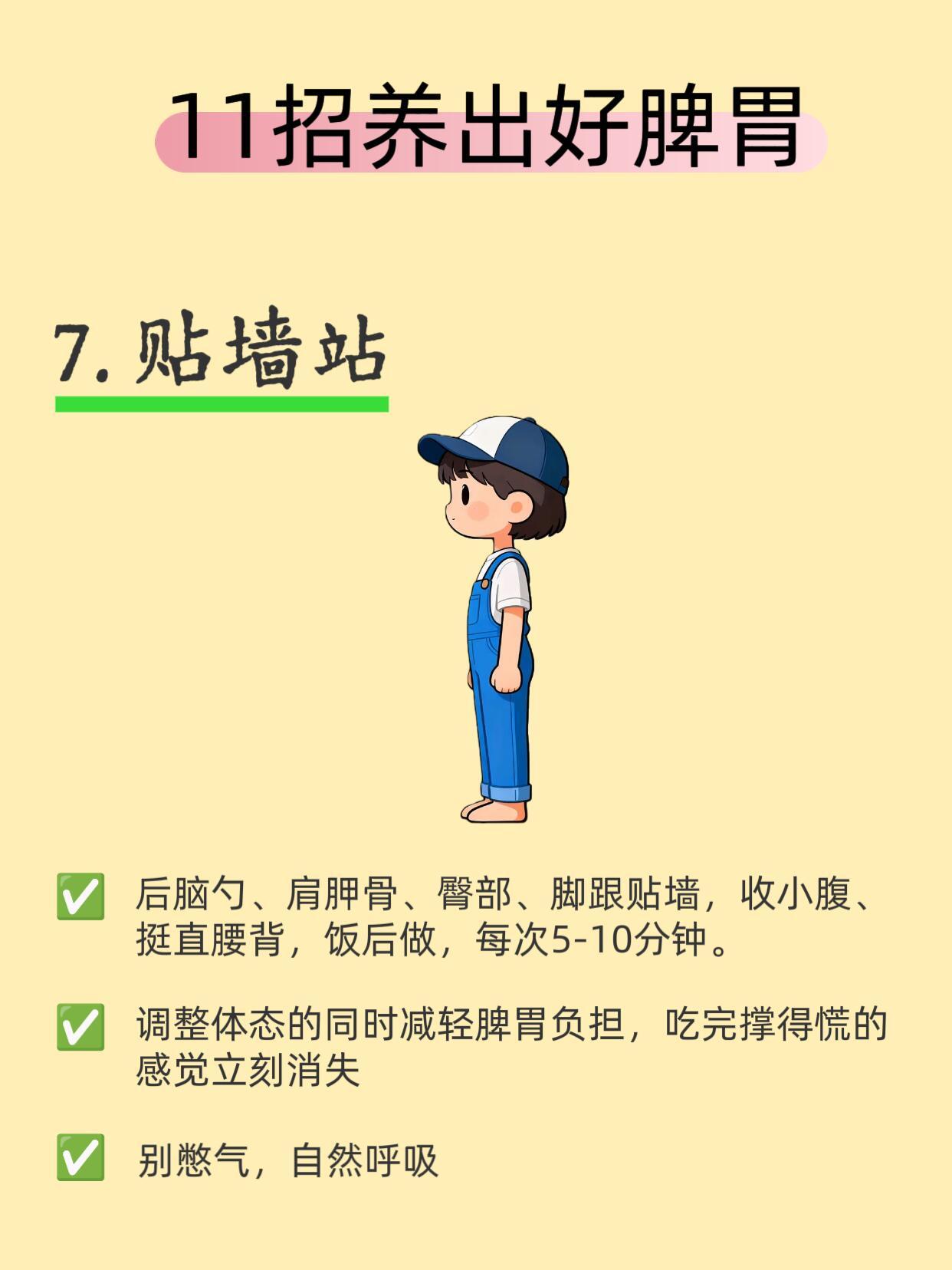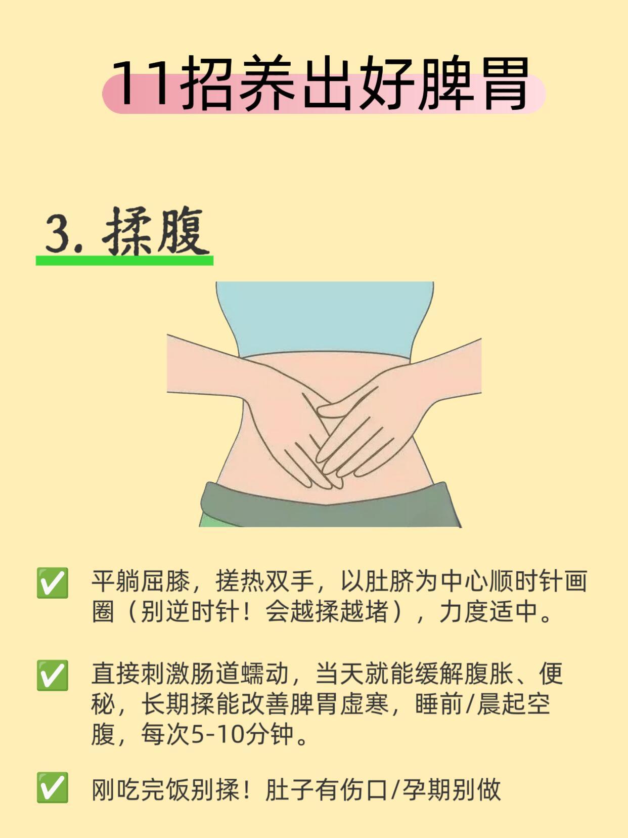 脾胃差最喜欢的运动,11招养好脾胃有没有姐妹跟我一样?吃点生冷、油腻就胀气,明明没吃多少却撑得慌,脸色还暗沉沉的~ 后来发现脾胃不用“猛养”,就靠日常这些温和小动作,成人、长辈都能做,碎片时间就能安排,坚持下来消化顺多了!🌟 11个家常养脾动作(简单好坚持)1⃣️. 饭后溜达:饭后30分钟慢走,不超7500步,温和促消化,别快走、别吹冷风;2⃣️. 金刚跪:双膝跪地坐脚后跟上,腰背挺直,饭后5-10分钟做3-5分钟,缓解胃胀反酸,膝盖不好垫软垫;3⃣️.揉腹:平躺屈膝,搓热双手顺时针轻揉肚脐5-10分钟,睡前/晨起空腹做,缓解腹胀便秘,刚吃饱别碰;4⃣️. 八段锦:一手托举一手下按,左右交替,饭后1小时做5组,疏通脾胃经络,新手跟标准视频学;5⃣️. 还阳卧:平躺脚心相对,双手放肚子,睡前15分钟做,缓解手脚冰凉,腿分不开别硬掰;6⃣️. 踮脚尖:缓慢踮起保持3-5秒放下,每天10分钟,每30-50个歇1分钟,改善久坐胀气;7⃣️. 贴墙站:后脑勺、肩臀脚跟贴墙,收小腹,饭后做5-10分钟,减轻脾胃负担;8⃣️. 猫牛式:四点支撑弓背塌腰交替,空腹做5-10组,促进肠胃蠕动,膝盖疼垫瑜伽垫;9⃣️. 金鸡独立:单脚站立抬另腿屈膝,早晚各1分钟,刺激足部经络,站不稳扶墙;🔟. 腹式呼吸:坐/躺时吸气鼓腹、呼气收腹,每次5分钟,增强脾胃运化,别用胸呼吸;1⃣️1⃣️. 养脾泡脚:40-43℃温水泡15-20分钟,晚7-9点/餐后1小时做,可加生姜片/艾叶,空腹、刚吃饱别泡。✨ 小提醒所有动作都以“舒服不勉强”为原则,不用贪多,选2-3个贴合日常的坚持就好~ 脾胃调理就像煲汤,得慢慢熬,把这些小动作融入生活,不用专门挤时间,慢慢就会发现:胃口开了,肚子不胀了,脸色也透着健康光泽!脾胃养脾胃健康养生